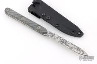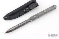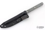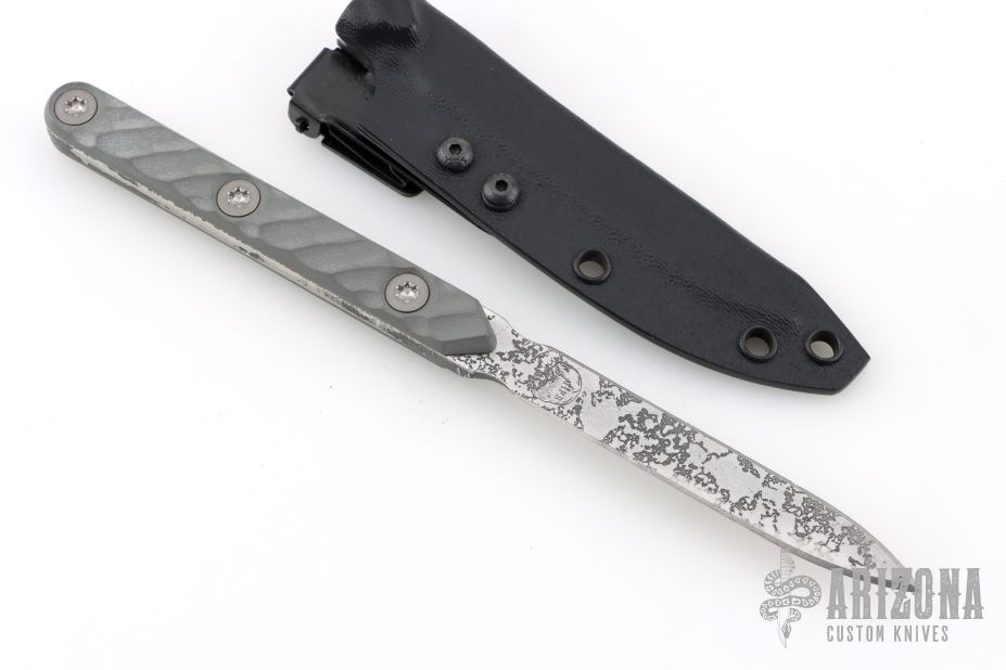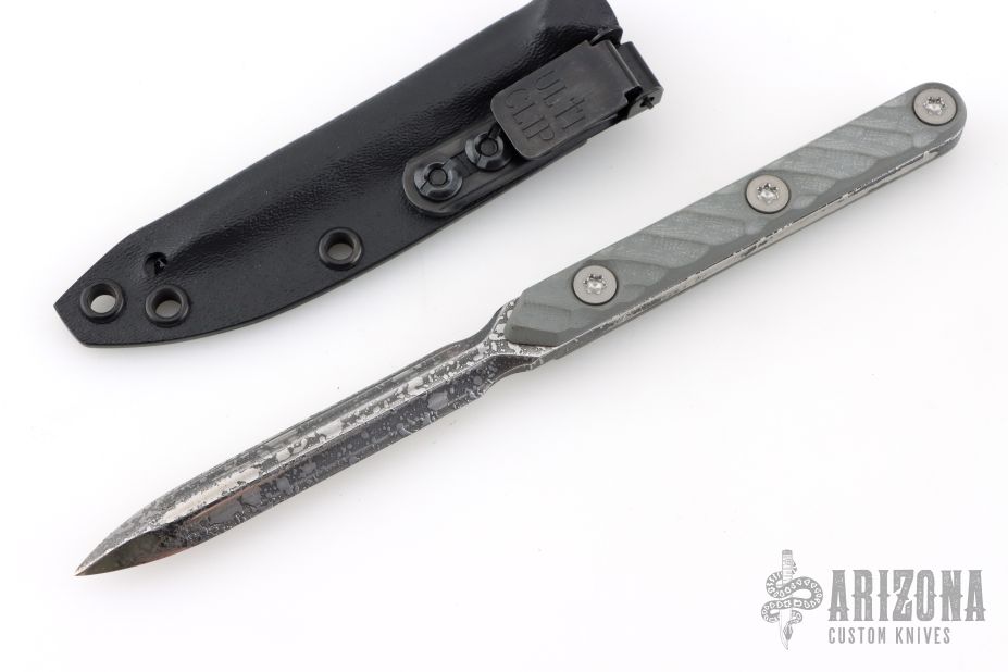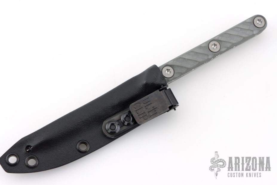 This Spike by Half Face blades. Has a chisel ground acid etched blade with sculpted gray G-10 scales. Comes with kydex sheath with ulti-clip. Excellent Condition.