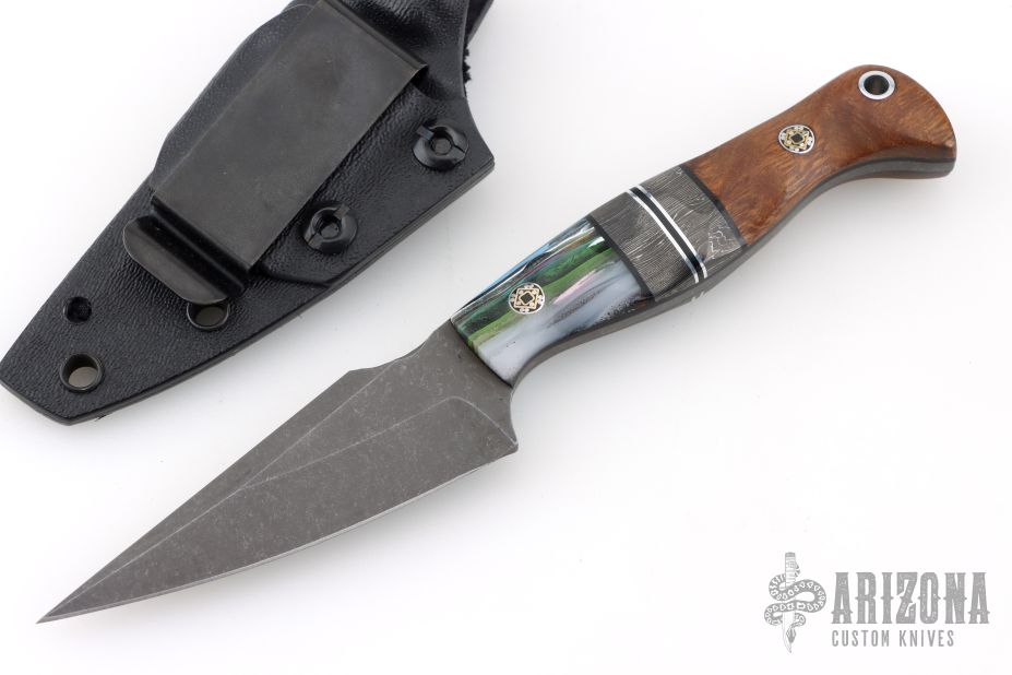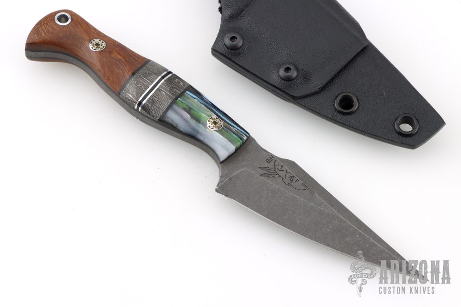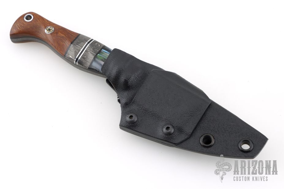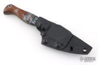 This Gulo Gulo by Half Face Blades features a darkened blade with false top edge, .140" blade stock and 1.086" blade depth, full tang construction.  The handle has sculpted segmented scales with composites, black/silver spacers, with mosaic pins, black liners and lanyard hole in pommel. Comes with a kydex sheath with belt clip. Excellent condition.