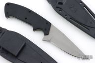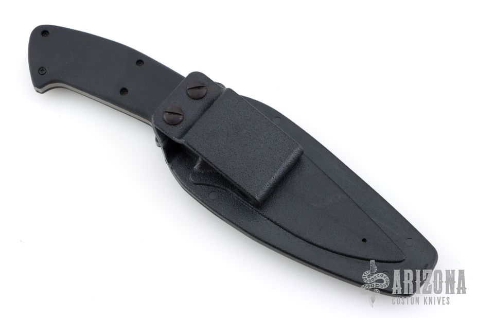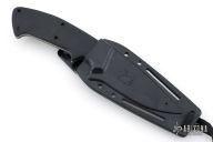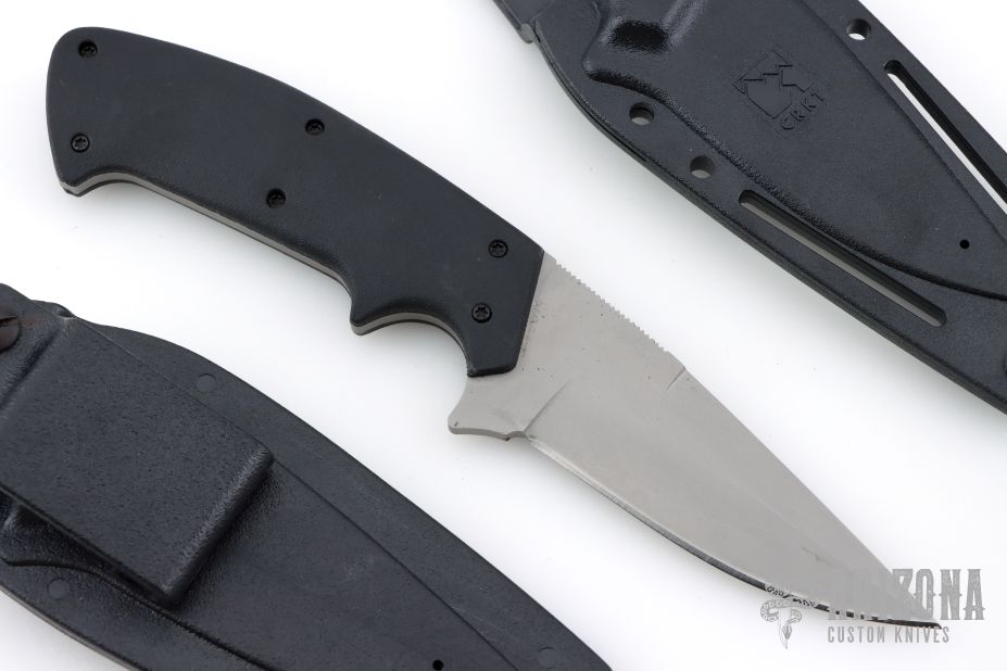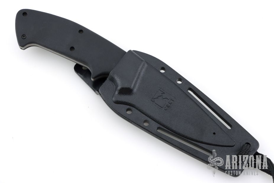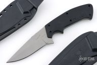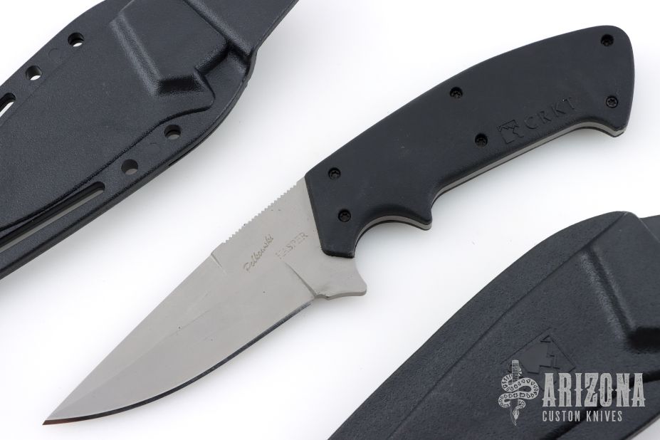 This CRKT Polkowski Kasper Companion, it has a bead blasted blade with notched thumbrest and false top edge, .146" blade stock and 1.28" blade depth, full tang construction with black FRM scales. Comes with molded plastic sheath. It has some scuffs, otherwise excellent condition.