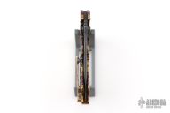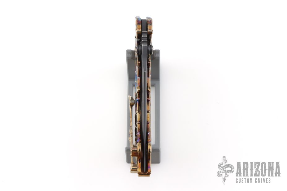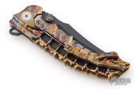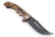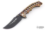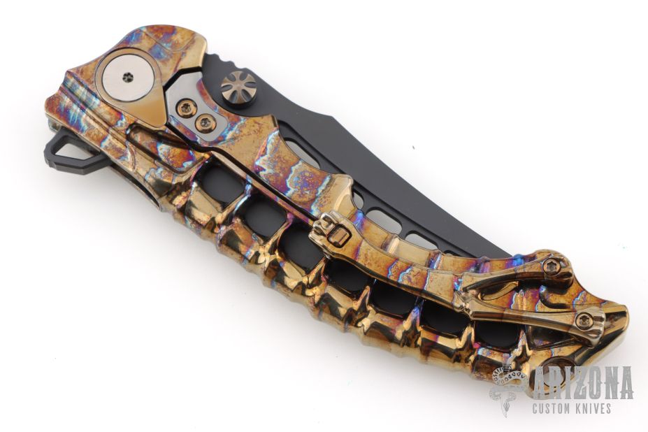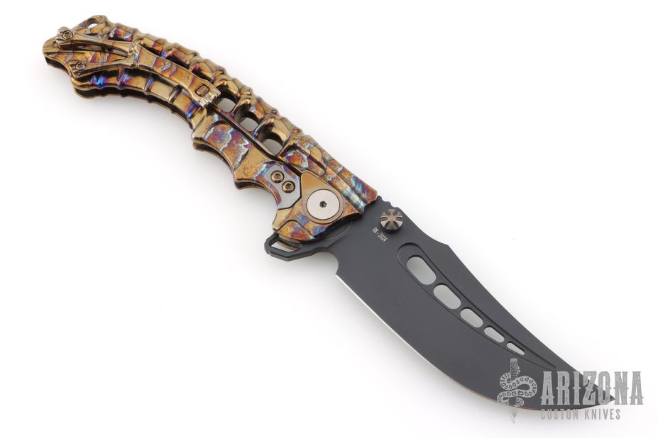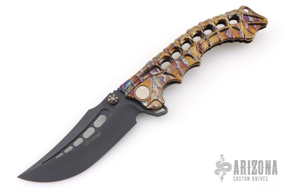 This stunning folder from South African maker Andre de Villiers is a great example of art and function. The Scavenger's trailing point blade is M390 and the handle a skeleton titanium with matching titanium clip. Sports both thumb studs and large skeletonized flipper. The action is smooth, lockup is secure, the feel is light and agile. Condition is excellent. Comes with zippered case. Dated 08-2024 on the blade.