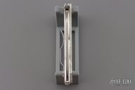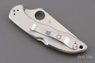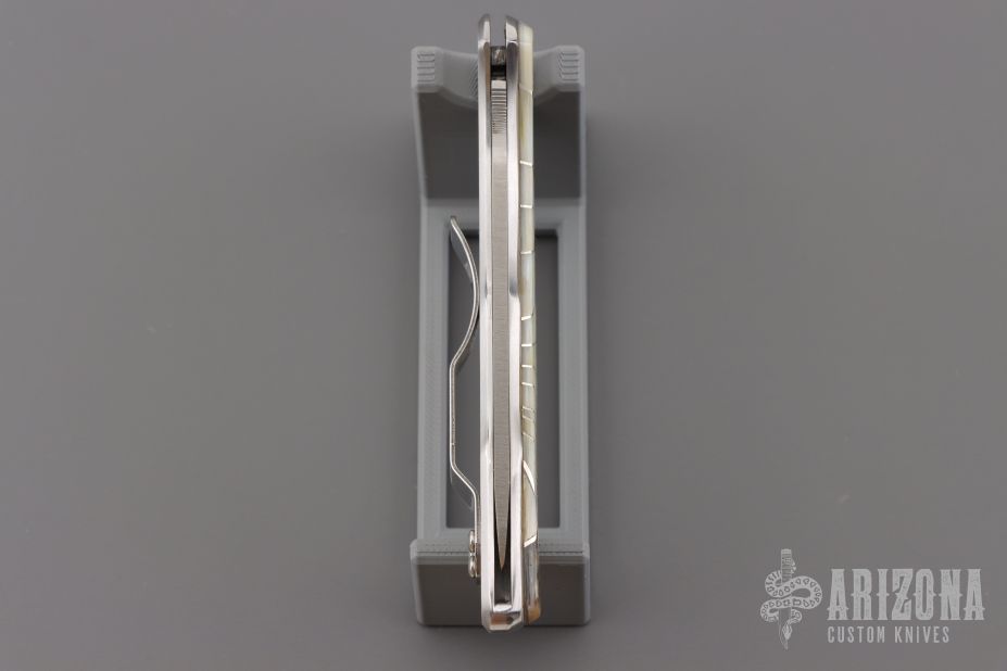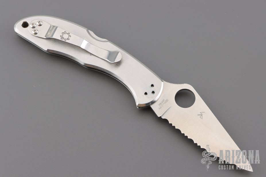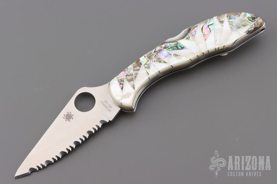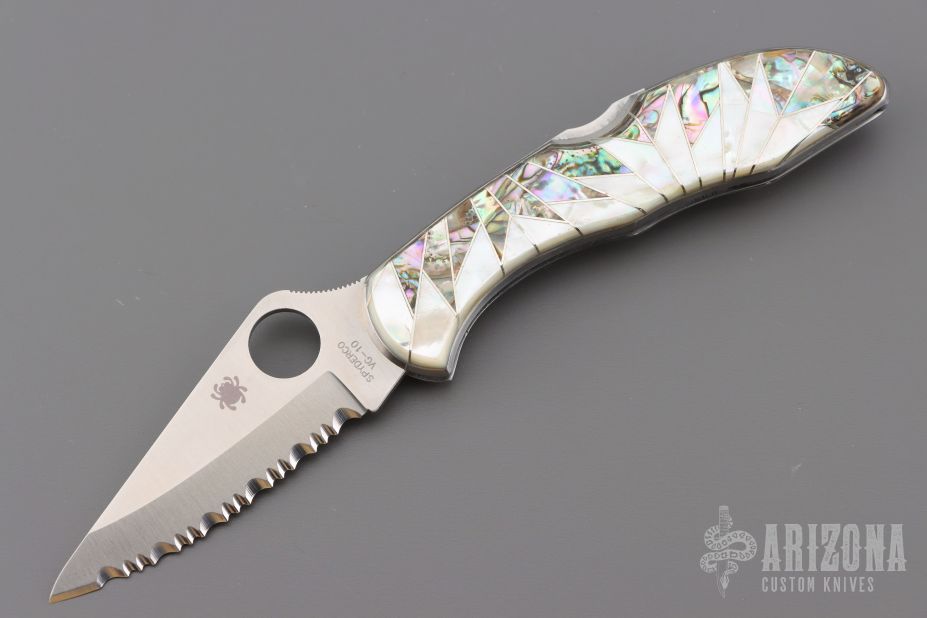 This C11S Delica from Spyderco has been modified by Santa Fe Stoneworks. It features a satin finished clip point serrated blade with thumb hole and notched thumb ramp. The "A" side of the handle is comprised of abalone and mother of pearl overlays with nickel silver accents, stainless steel frame. The stainless steel clip is reversible for tip up or tip down carry. Lanyard hole in pommel. Comes with original box and papers. Excellent condition.