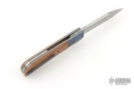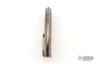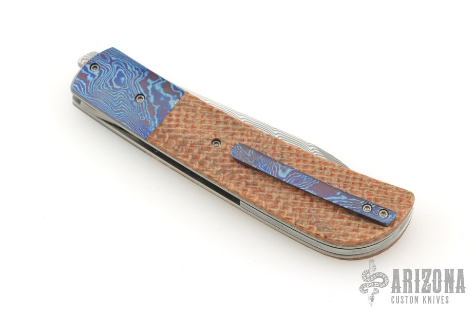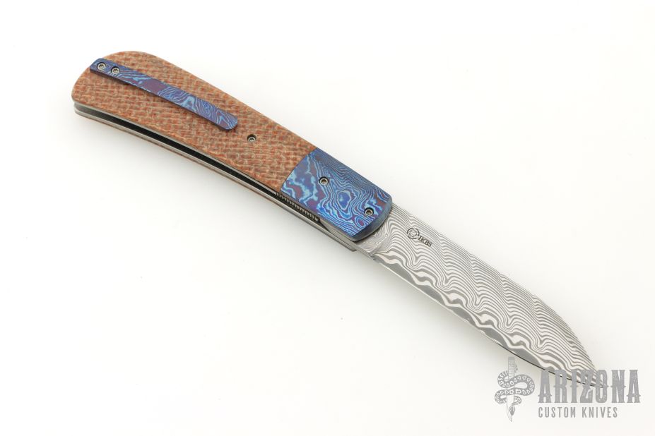 This Zulu Front Flipper from Jason Clark features a Damasteel blade with swedge and notched flipper. The handle has Timascus dovetailed bolsters, Shadetree canvas micarta scales, titanium liners, tip up Timascus pocket clip, and floating Damasteel backspacer. Rides on IKBS, nice blade seating, detent and lock up. Includes C.O.A. and leather pouch. Excellent condition.
