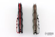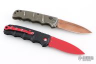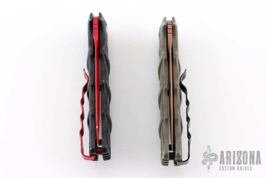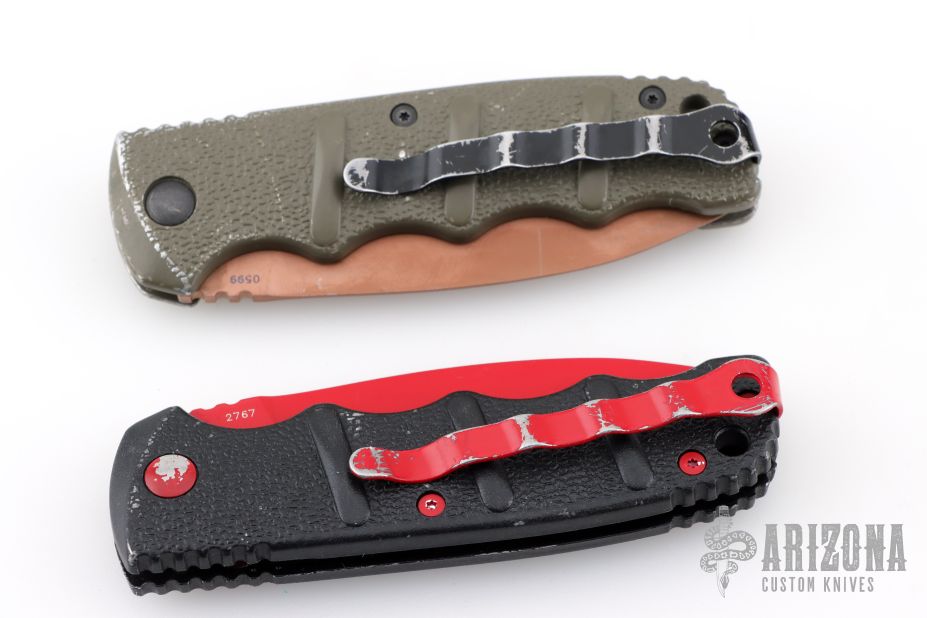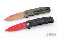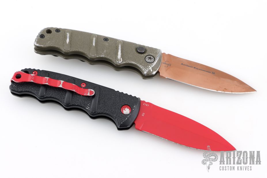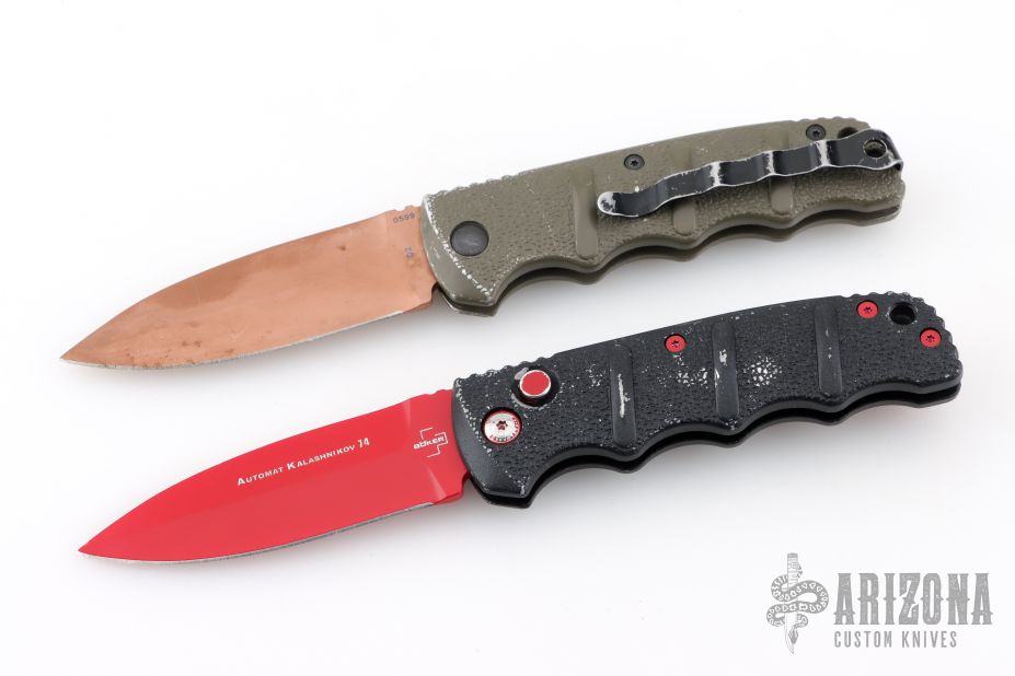 Set of two Kalashnikov 74 knives by Boker. Spear point blades with textured aluminum covers with tip up clip. Has scuffs and scratches throughout, fair condition otherwise. The tan/green desert warrior one is a lefty.