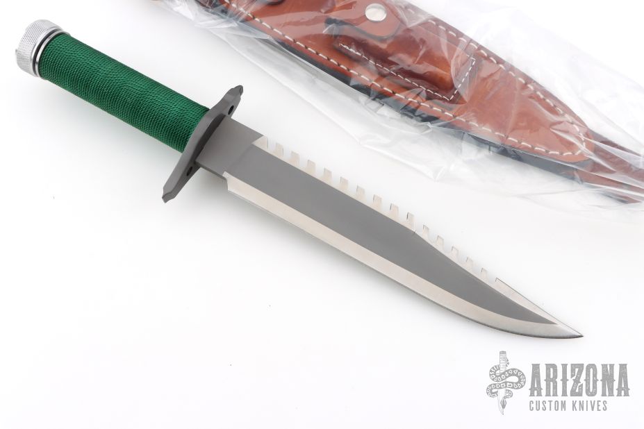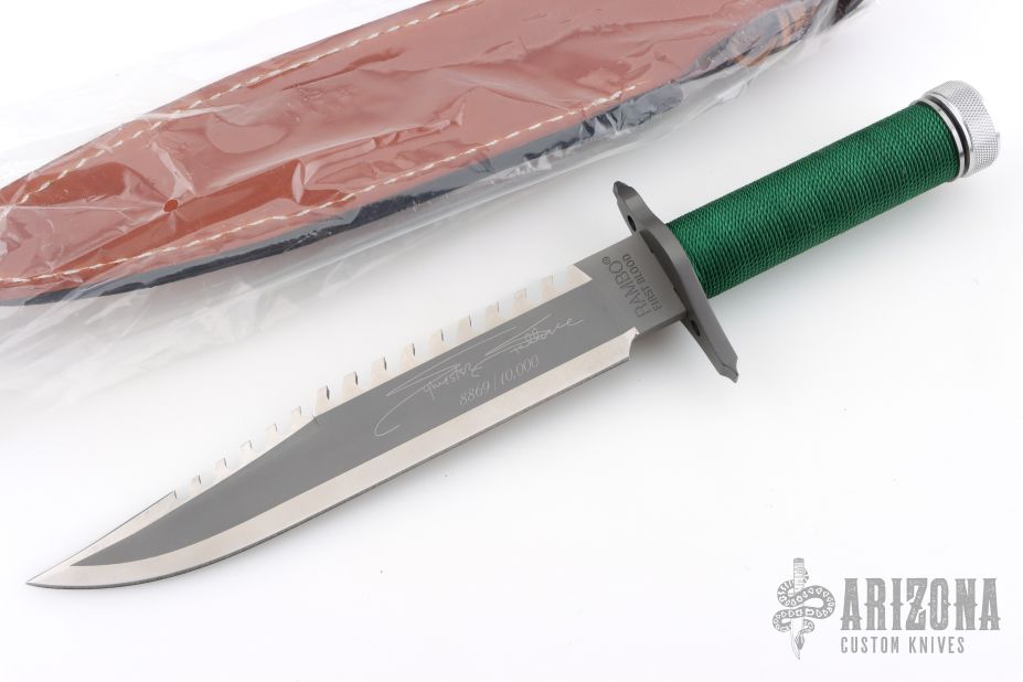 This Sylvester Stallone Signature Edition Rambo: First Blood knife, produced by Master Cutlery in collaboration with Hollywood Collectibles Group, is a highly detailed and collectible reproduction of the iconic survival knife.