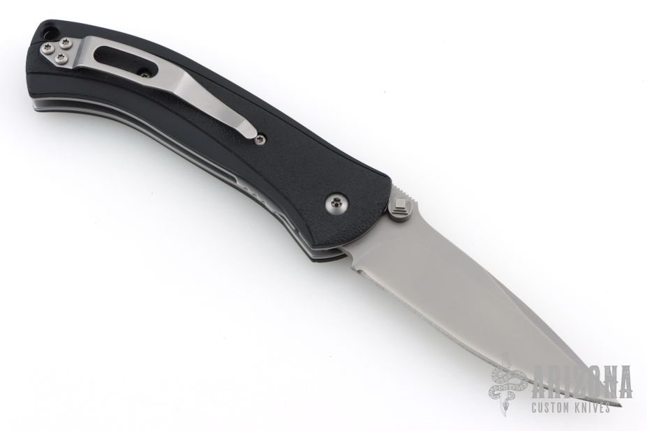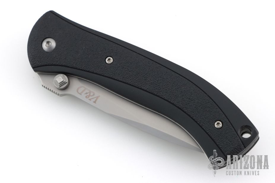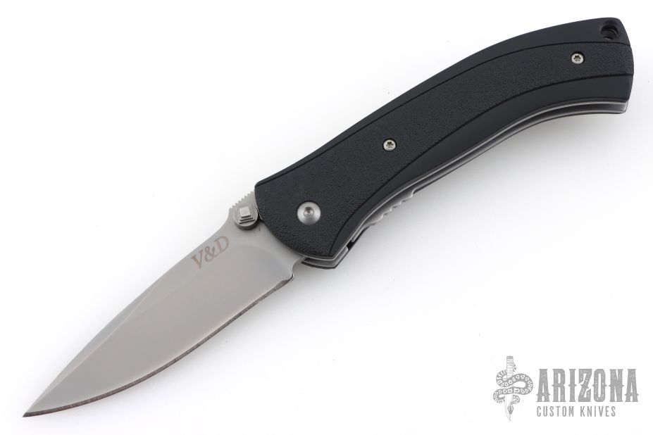 This Scale Release Automatic from V&D Knives (Butch Vallotton and Matt Diskin) features a fine bead blasted spear point blade with swedge, dual thumb studs and notched thumb rest. The handle is comprised of black polymer scales over steel liners and black polymer backspacer. Lanyard hole in pommel. Stainless steel tip up clip and lanyard hole in pommel. Excellent Condition.