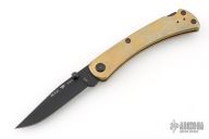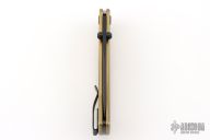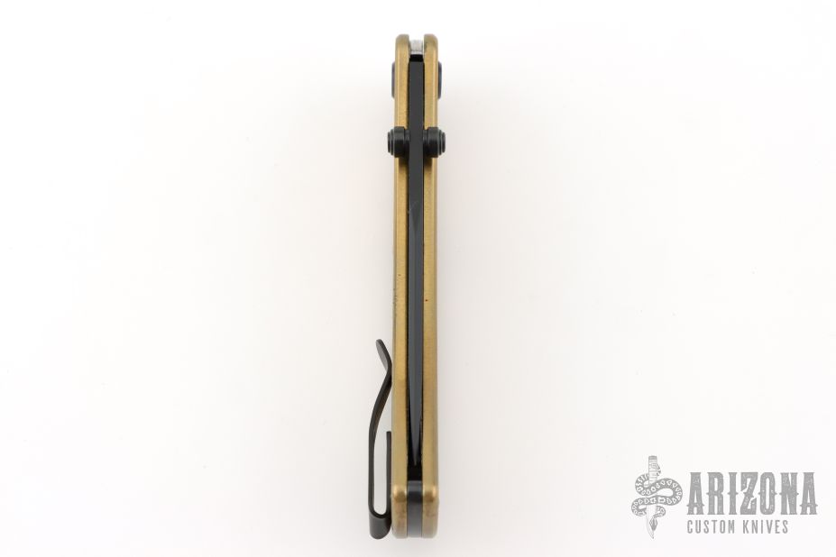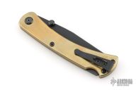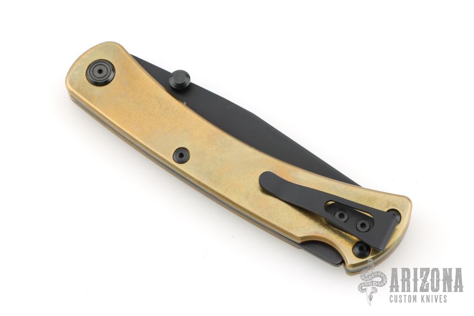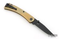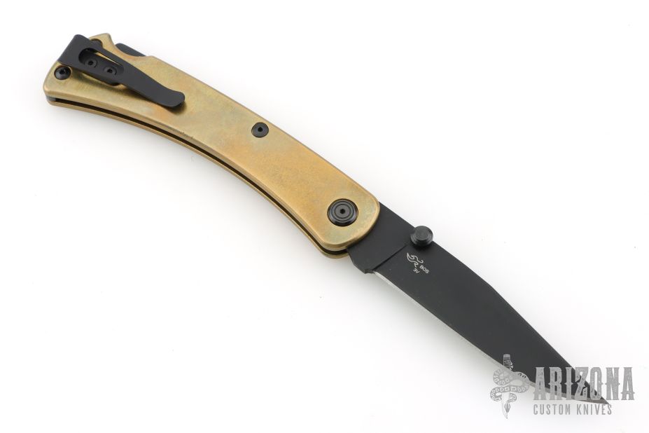 This Slim Pro TRX by Buck features a black blade with dual thumbstuds. The handle has a brass frame with black stainless steel backspacer and tip up reversible clip, black hardware. Comes with original box, pouch, and COA. Listing also includes two pewter Buck Anvil beads. The handle has a light patina, and some light scuffs, otherwise Excellent condition.