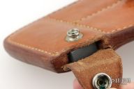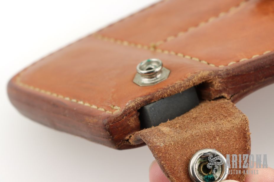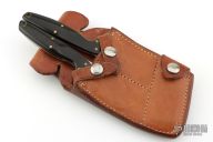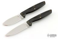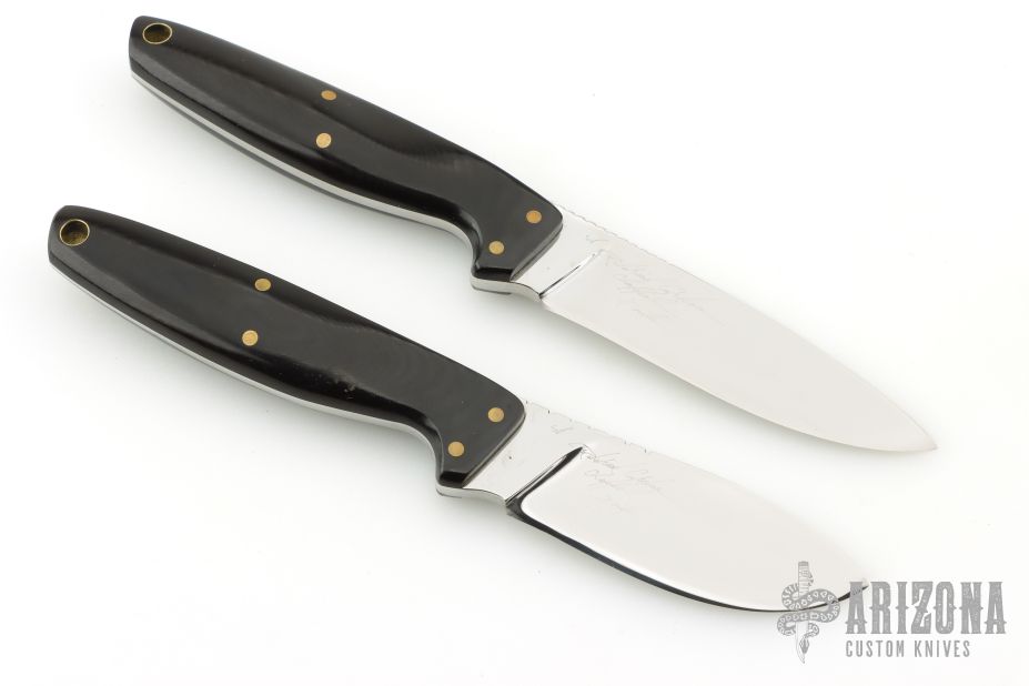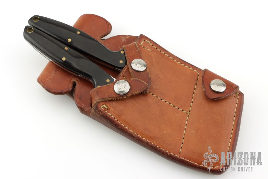 This set by Rod Chappel features a skinner with a mirror polished blade and a notched thumbrest, .181" blade stock and 1.033" blade depth, full tapered tang construction. The handle has a black linen micarta scales with brass pins and lanyard hole. The other knife is a caper with a mirror polished blade with notched thumbrest, .171" blade stock and .914" blade depth, full tapered tang construction. The handle has black linen micarta scales with brass pins and lanyard hole. Comes with a brown leather sheath that holds both knives and a sharpening stone. Excellent condition. Both knives are dated June 16th, 1975.