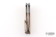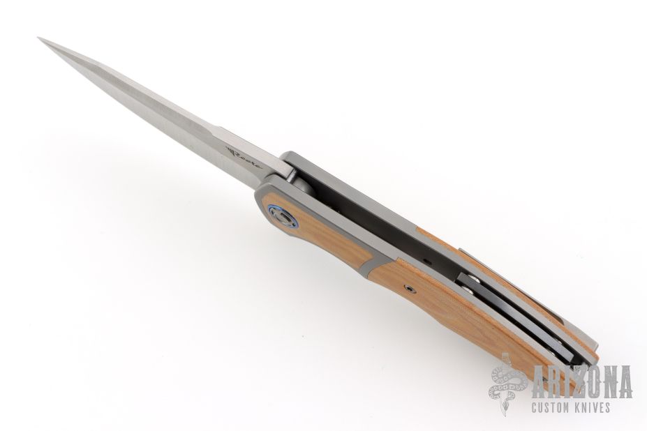 This Mini Crossroads flipper by Reate is a Kirby Lambert design, it features a satin finished blade with a notched flipper. The handle has a blasted titanium frame, white micarta scales, anodized titanium pivot collars, blasted titanium tip up clip and floating backspacer. Rides on bearings, nice detent, lockup and blade seating. Comes with original box and zippered case. Excellent condition.