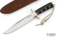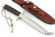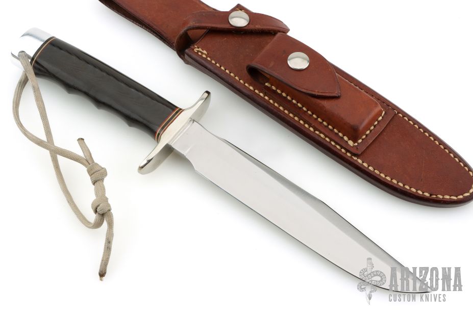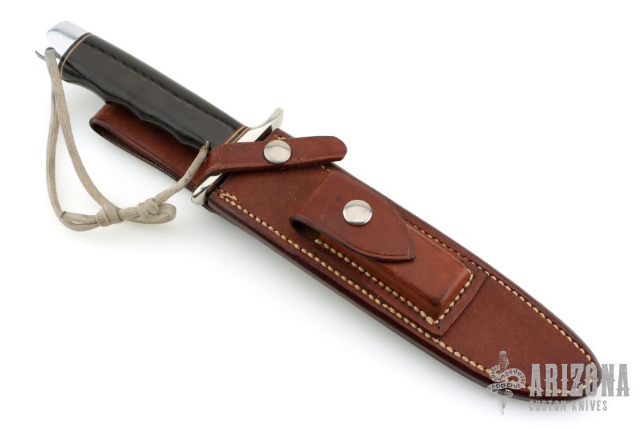 This Model 1-7 from Randall Made Knives features a satin finished clip point blade with sharpened top edge, .195" blade stock and 1.159" blade depth, hidden tang construction. The handle is comprised of a nickel silver guard, red/white/blue spacers, black linen micarta grip with finger grooves, duralumin pommel with lanyard hole. Comes with a rough back brown leather sheath. Has a couple very light scratches, otherwise excellent condition.