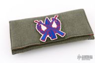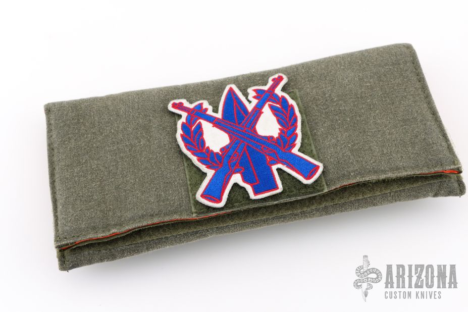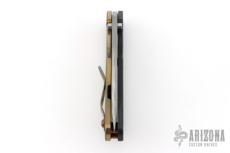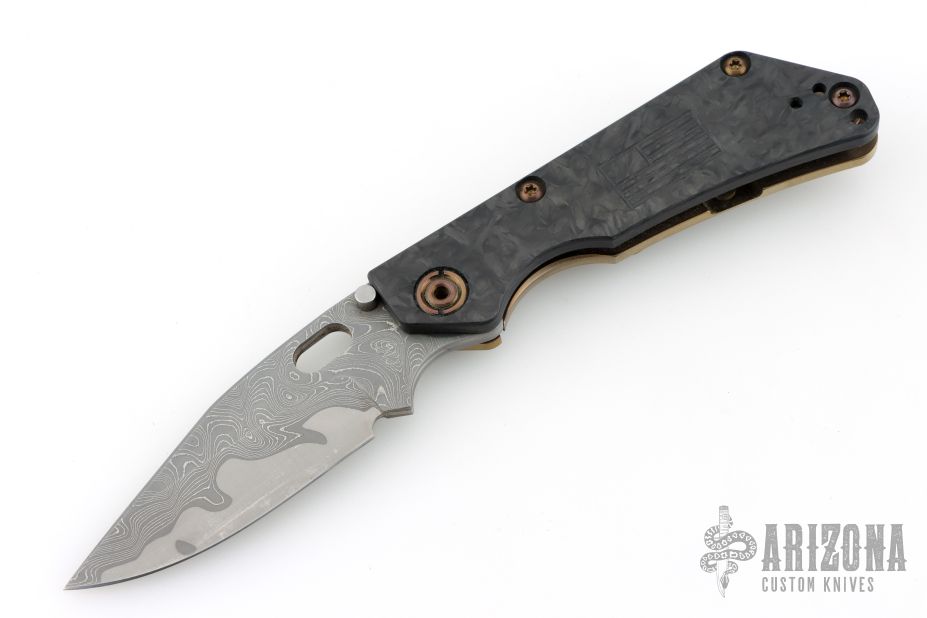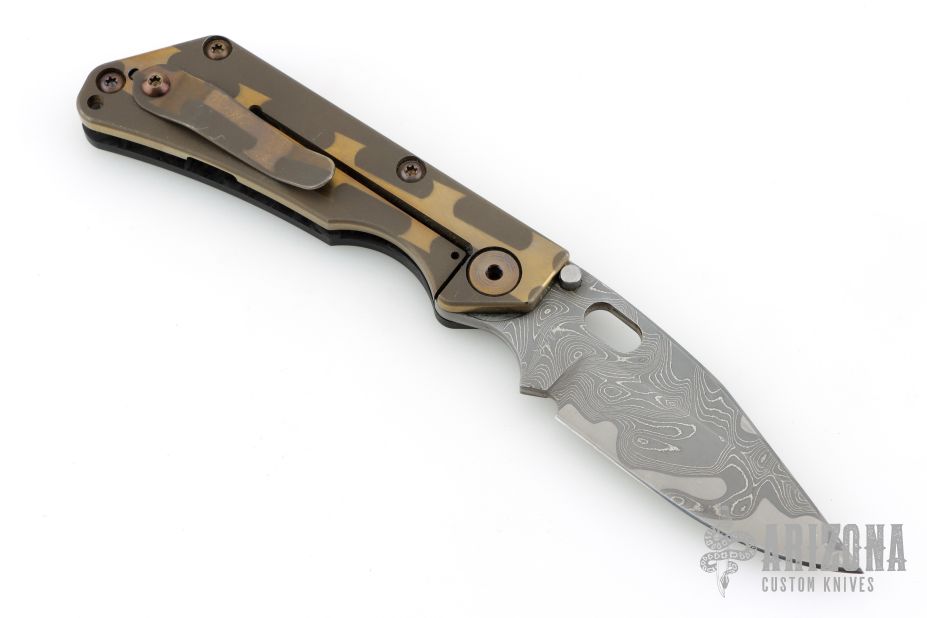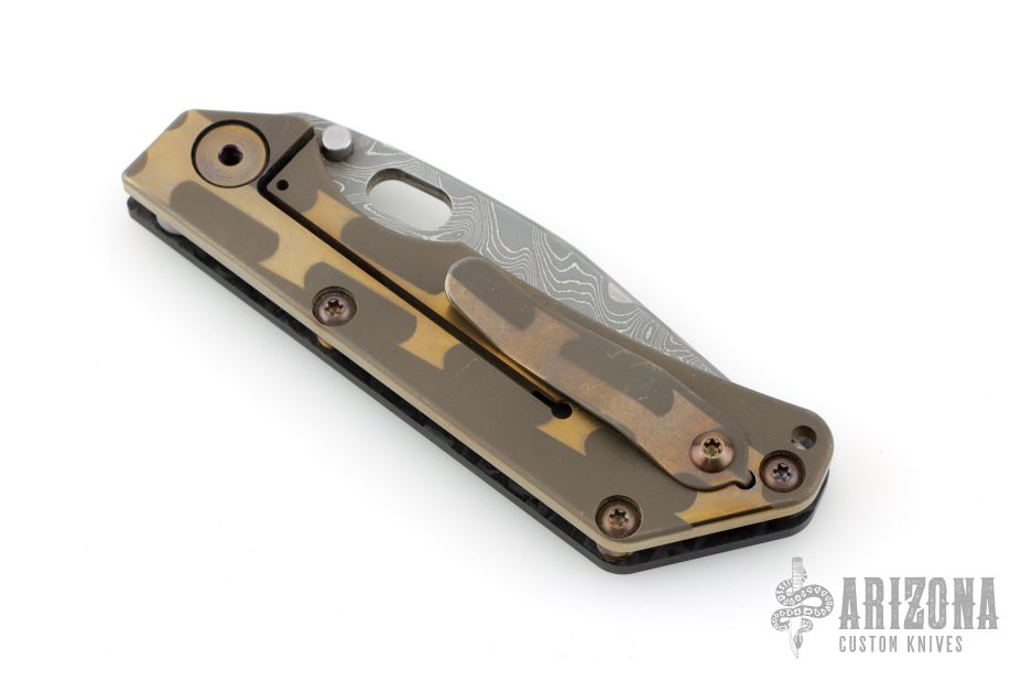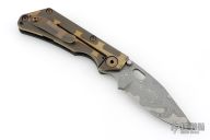 This DDC SNG Framelock Folder has a Chad Nichols San Mai Damascus blade with a thumbhole. The handle has a marble carbon fiber front scale with American flag milling, razor wire anodized titanium lockside, with matching tip up clip, anodized titanium barrel spacers. Centered blade and great lockup and detent with zero blade play. Beautifully presented piece. Has some light scuffs, otherwise excellent condition. Comes with padded nylon velcro case with DDC crossed rifles patch.