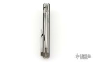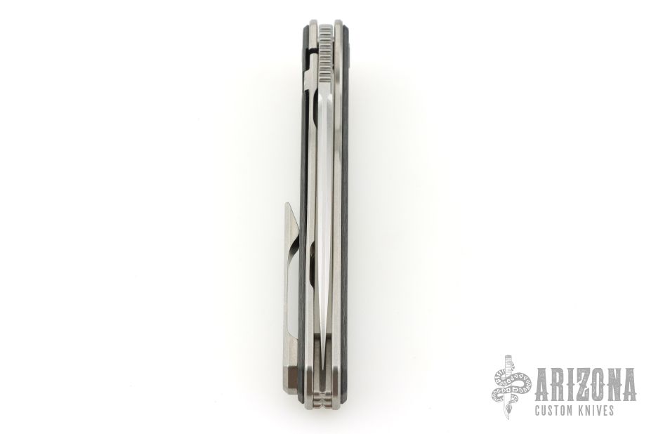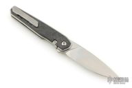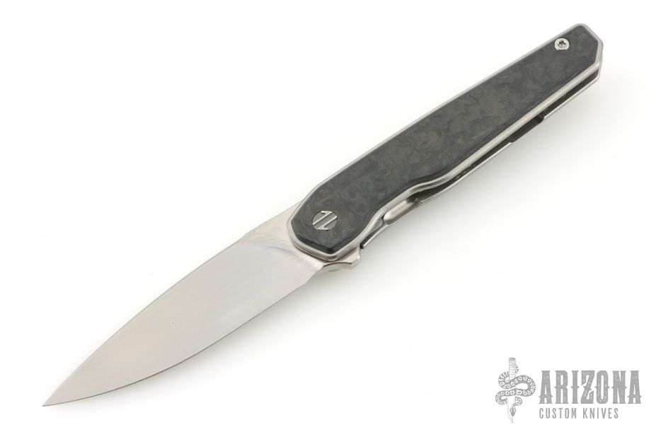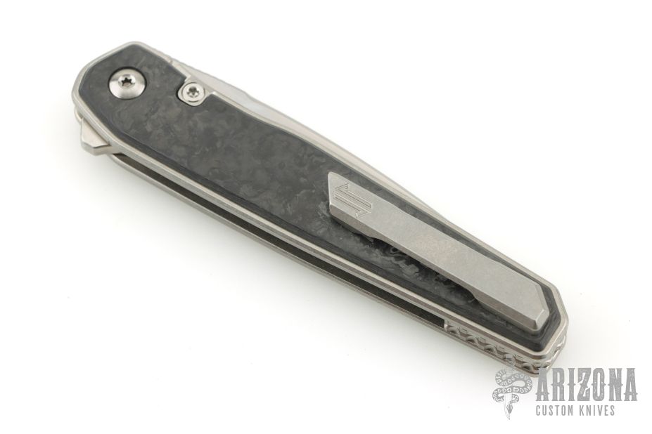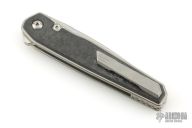 This LHC-X by Brown Knives features a drop point stonewashed blade with notched thumbrest and flipper. The handle has marble carbon fiber scales, stonewashed titanium liners, backspacer and tip up clip with hidden screws. Rides on bearings, nice detent, lockup and blade seating. Comes with original box and COA #233. Excellent condition.