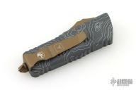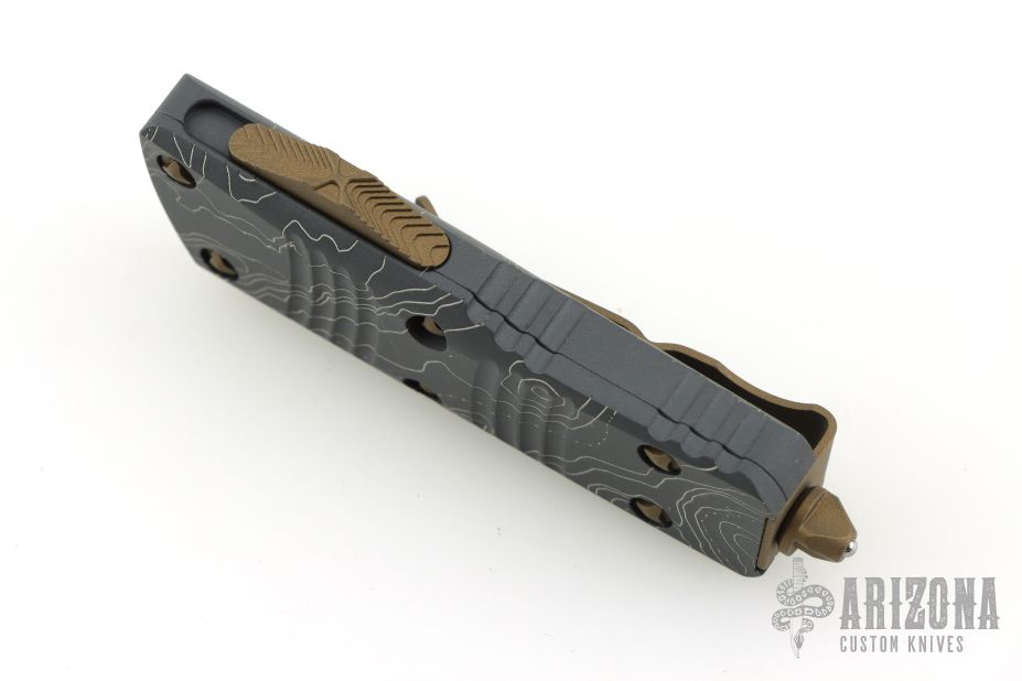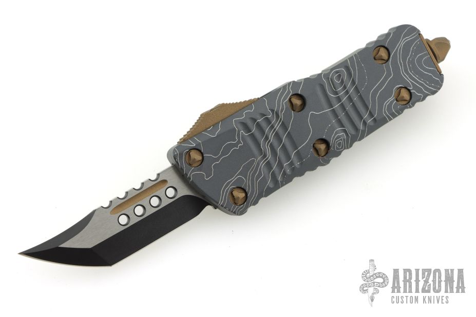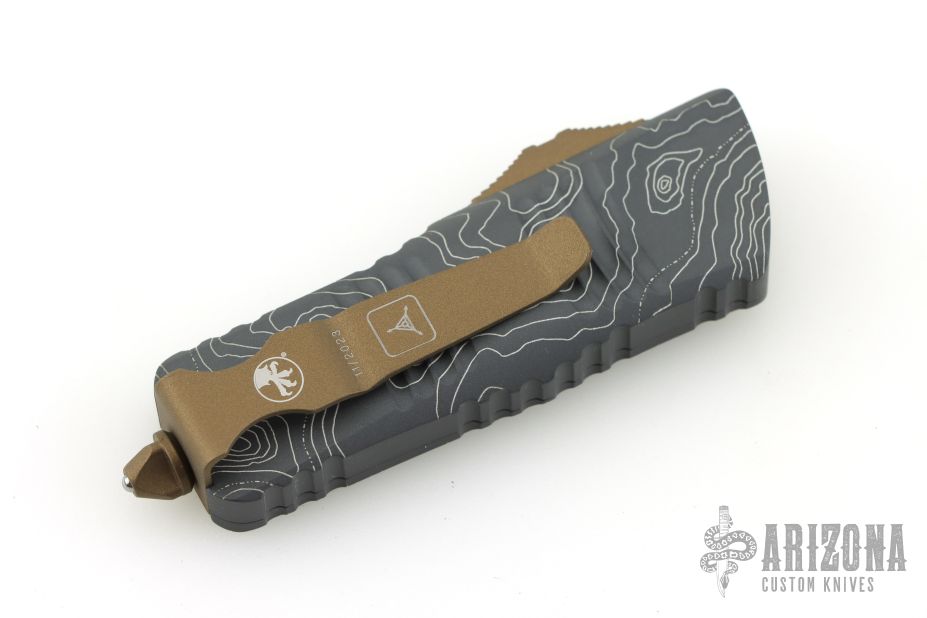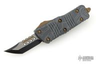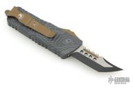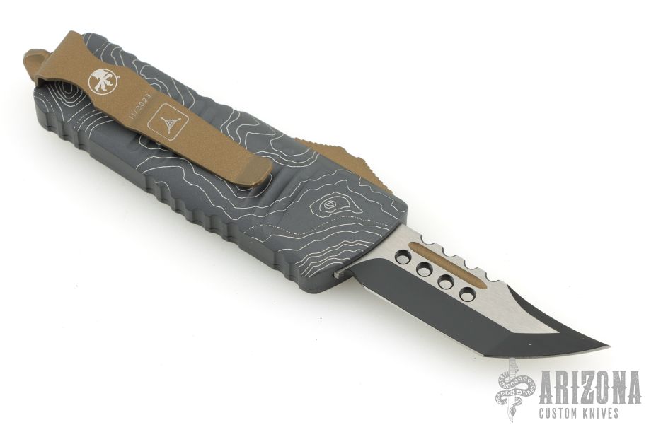 This Troodon Mini Hellhound OTF automatic by Microtech knives features an black Hellhound tanto blade, and a gray TOPO aluminum handle with bronzed hardware, tip down carry. Glass breaker. Dated 11/2023. Comes with original box and papers. Excellent condition.