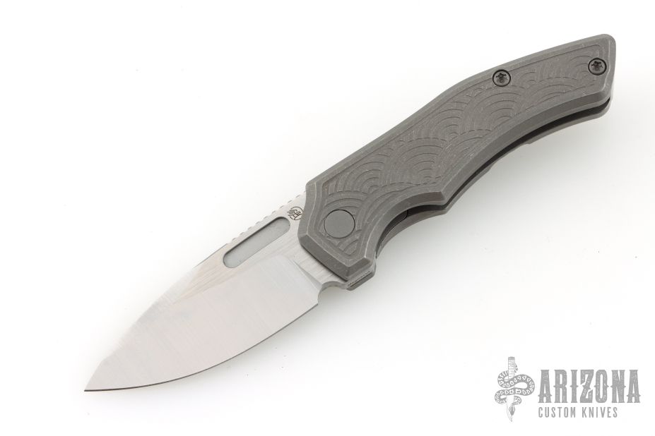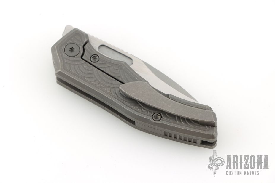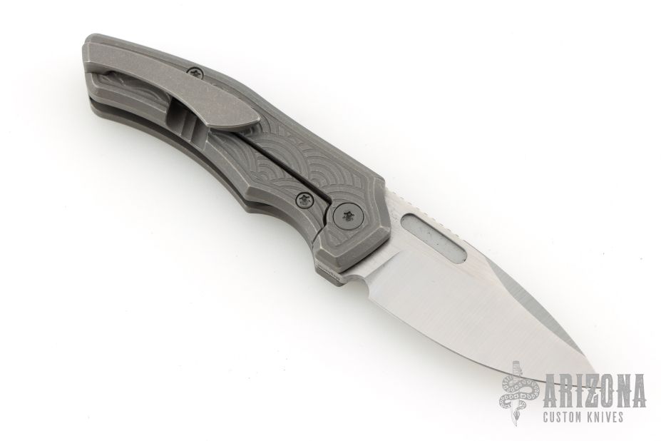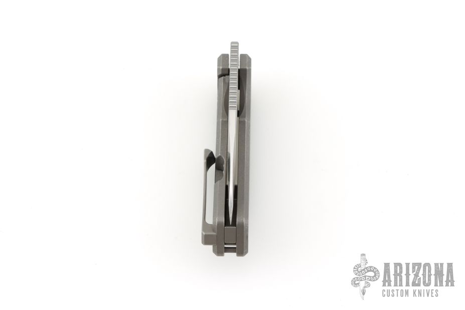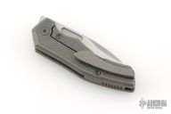 This Scout F2 by Griffin Company features a machine satin finished blade with fullers and notched thumbrest and front flipper. The handle has a light stonewashed titanium frame with milled inlays, titanium backspacer and tip up clip. Comes with original box and pouch. Excellent condition.