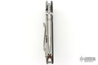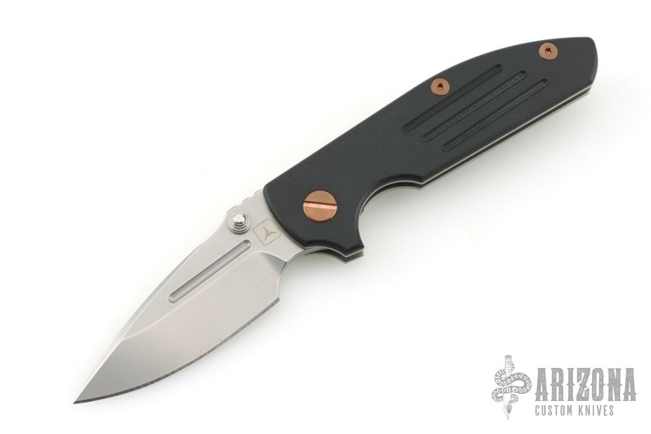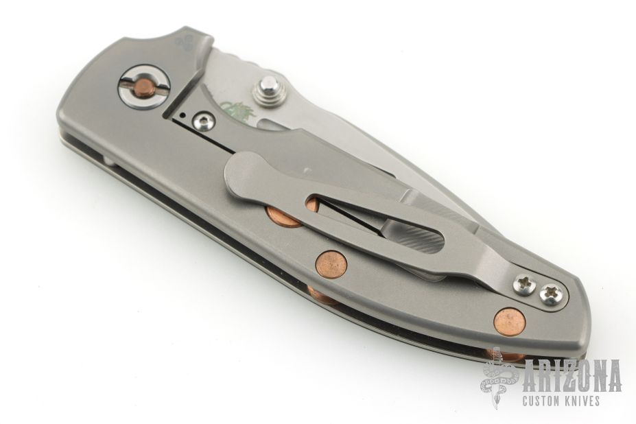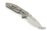 This TAD Dauntless Compact Hinderer features a spear point blade with fullers, notched thumbrest, and dual thumbstuds. The handle has a black G-10 front scale with 3 milled fullers, matte finished titanium frame with matching tip up clip. This knife features the Tri-Way pivot system. Excellent condition. Comes with original box and extra washers. Has copper hardware. Comes with original hardware.