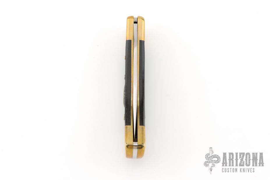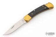 This Buck 110 "folding hunter" features a satin finished clip point blade with nail nick. It has ebony scales, brass bolsters and frame. Comes with original black leather sheath, box and papers. Excellent condition. Limited to 2000 pieces commemorating sixty years of the model 110.