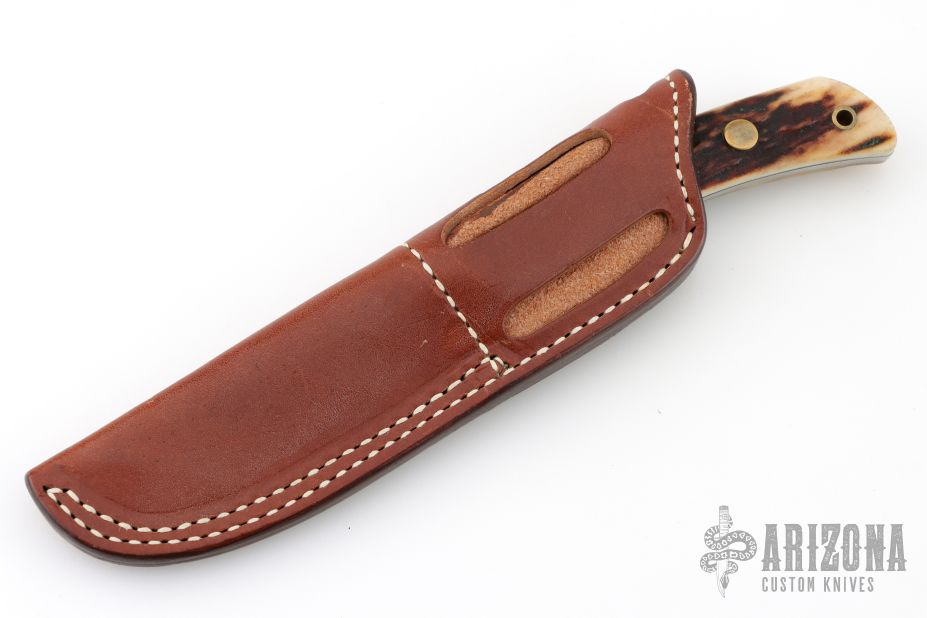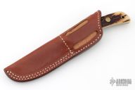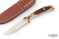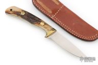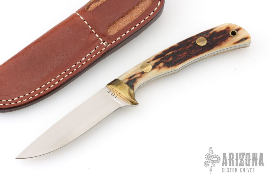 This fixed blade from by Jimmy Lile features a satin finish drop point blade with .110" blade stock and .889" blade depth. The handle is comprised of brass guard, pins and lanyard tube with stag scales over full tang construction. Comes with a brown leather sheath. Excellent condition.