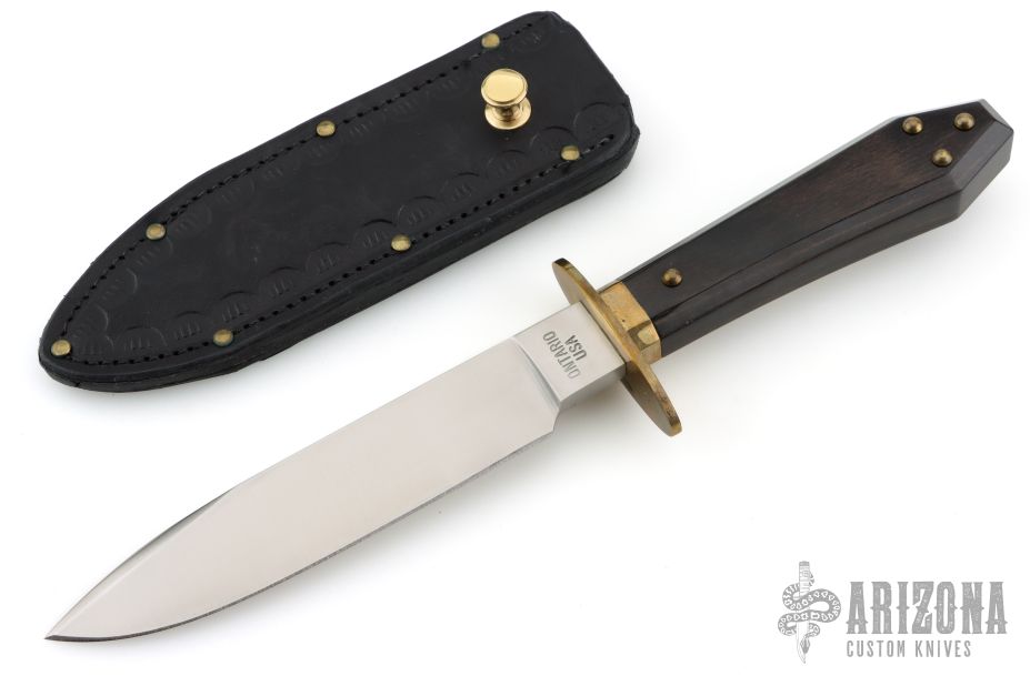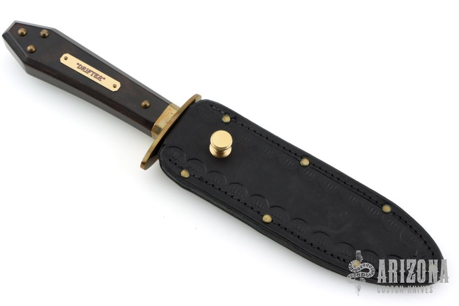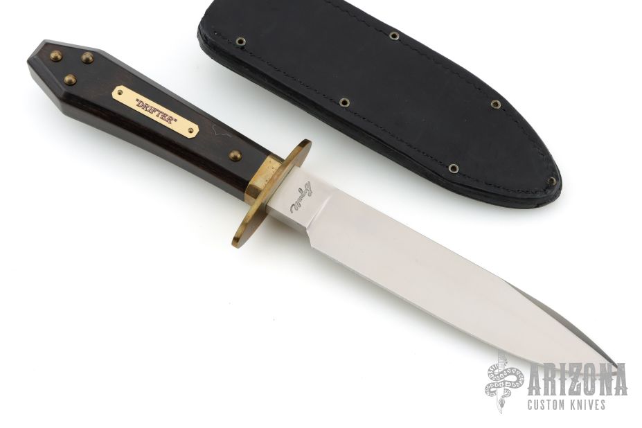 This is a discontinued Bill Bagwell designed Drifter Bowie, made by Ontario Knife. Has a satin spear point blade, .300" blade stock and 1.220" blade depth, hidden tang construction. Wooden coffin handle with nameplate and brass pins. Black leather sheath with brass rivets and stud. Has some light scratches, otherwise excellent condition.