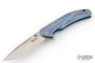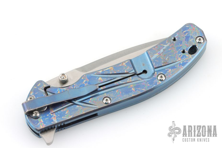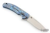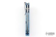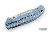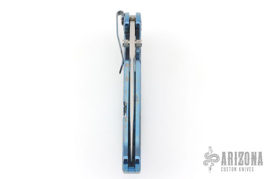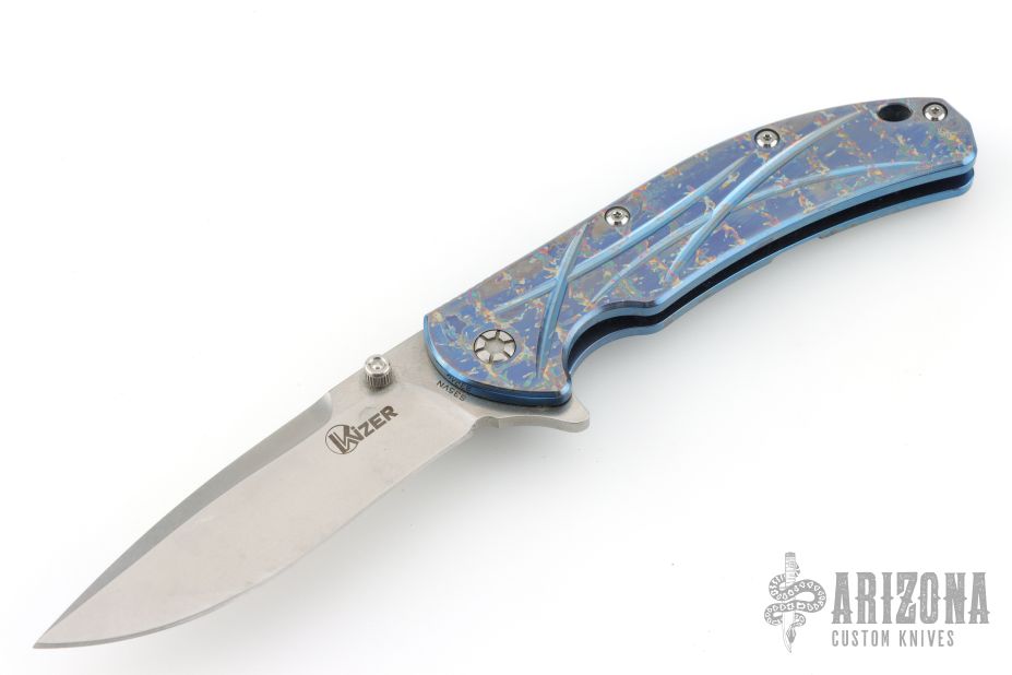 This knife Kizer features a tumble finished recurve blade with flipper tab and dual thumbstuds. The handle is comprised of polished and anodize finished titanium over titanium backspacer and matching tip down reversible clip. Has some marks on the clip. Excellent condition.