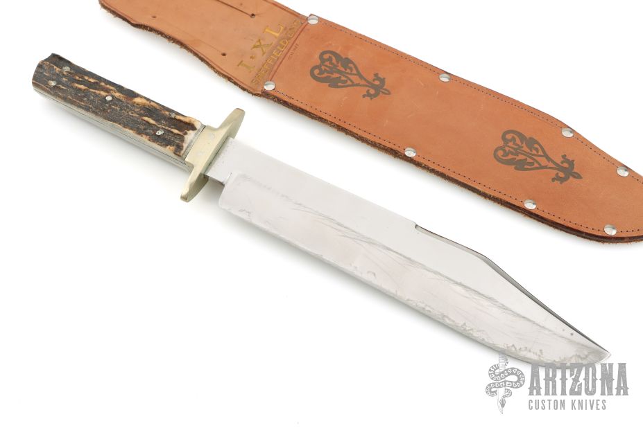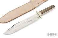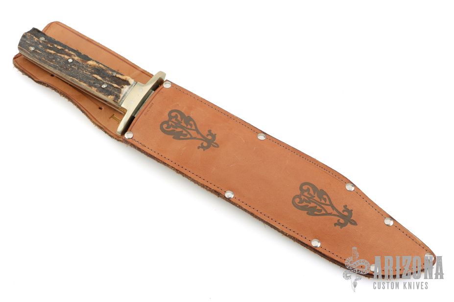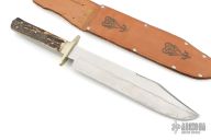 This Antique Bowie by George Wostenholm and Son features a satin finished blade with false top edge and mirror polished flats, .224" blade stock and 1.902" blade depth, full tapered tang construction. The handle has a nickel silver guard, stag scales and nickel silver pins. Comes with a brown leather sheath. Has some scratches, has been poorly sharpened, otherwise fair user condition.