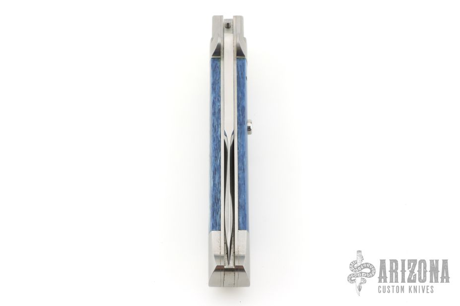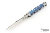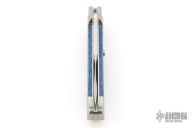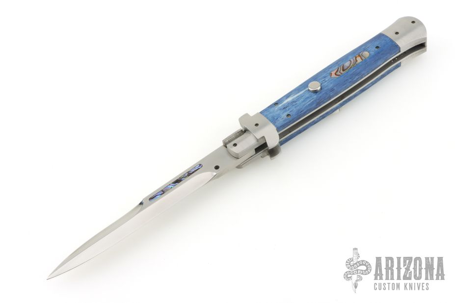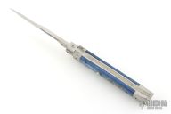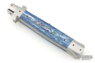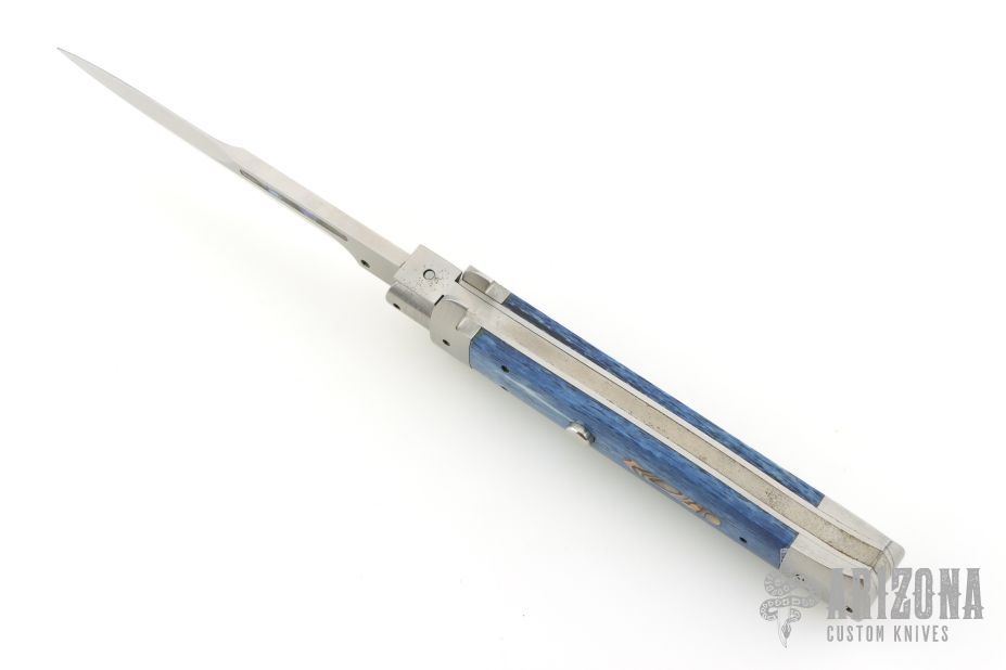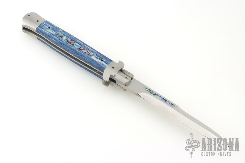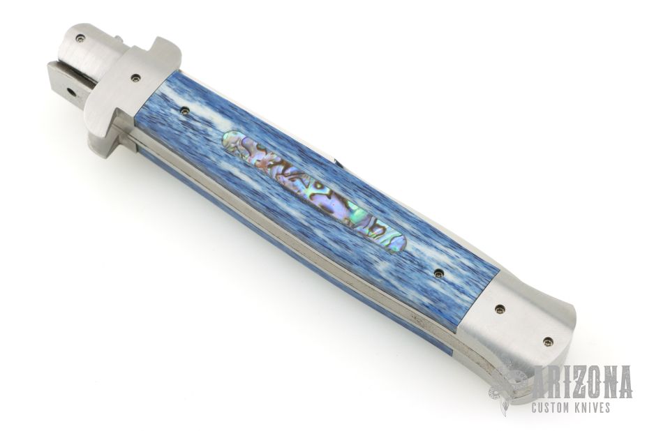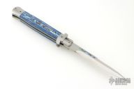 This Picklock by Burn Knives features a mirror polished bayonet style blade with false top edge, .192" stock. The handle has stainless steel bolsters, front and rear, giraffe bone scales with abalone inlays, push button, stainless steel liners, stainless steel backspacer. Comes with a zippered case. The lock is extremely difficult to disengage. Has a few light scratches and oxidation, otherwise excellent condition.