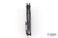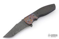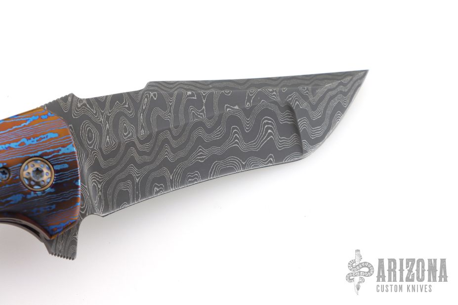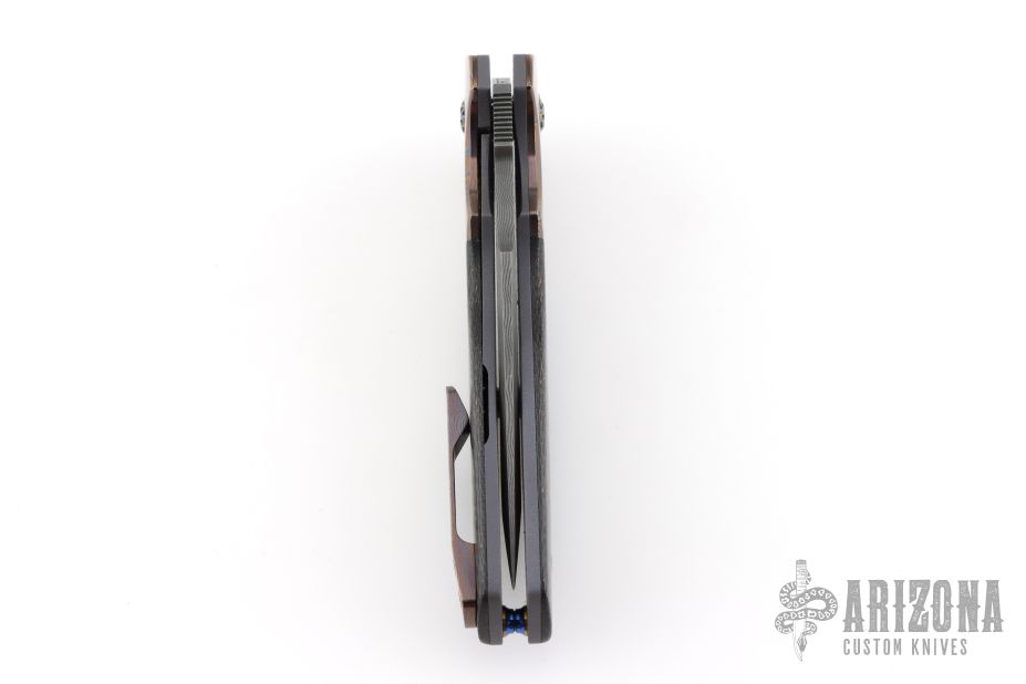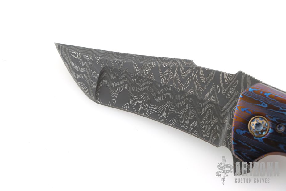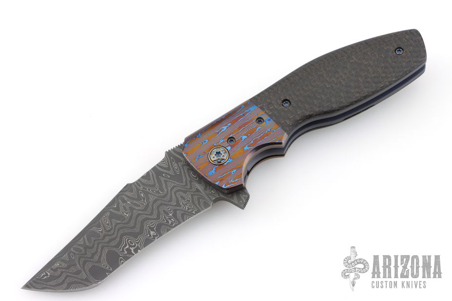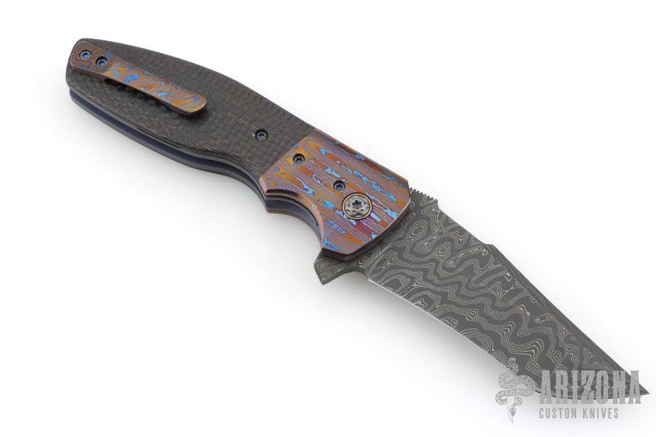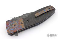 This Augustus Flipper by Kirby Lambert features a Damascus blade with notched thumbrest and flipper. The handle has MokuTi bolsters, lightning strike carbon fiber scales, bead blasted and anodized titanium liners, two-tone anodized titanium barrel spacers, and a tip up MokuTi clip, anodized titanium hardware and pivot collars. Nice detent, lockup and blade seating, rides on bearings. Comes with nylon zippered case. Excellent condition.