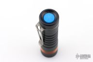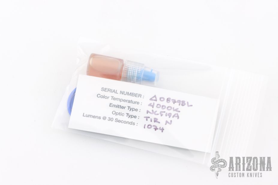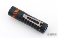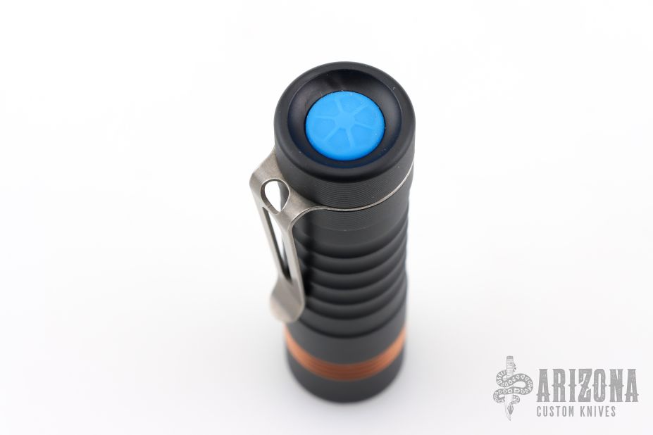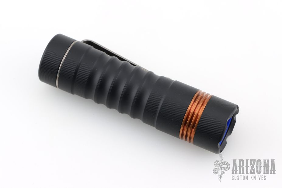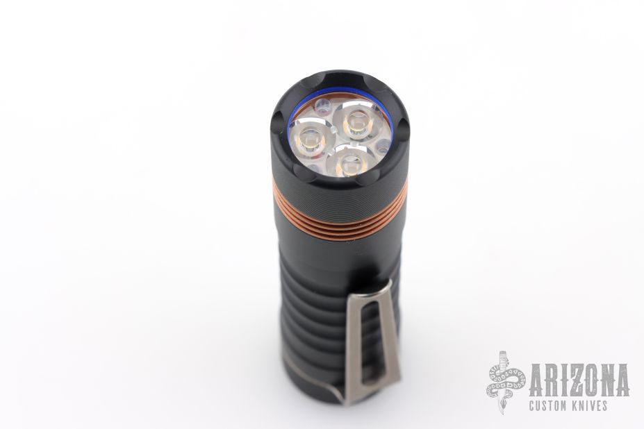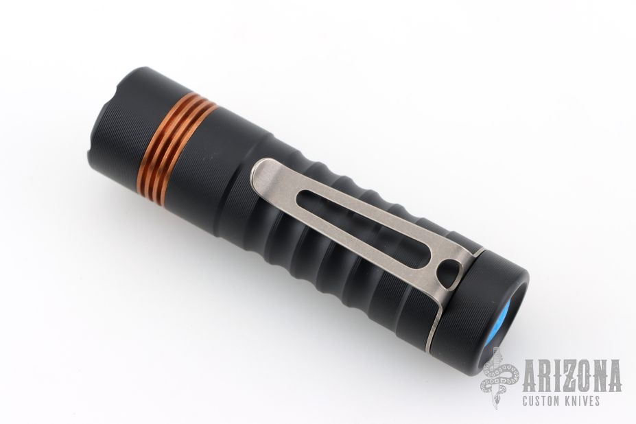 Prometheus “Delta” Flashlight – This is a custom Delta with 519a/4K Nichia Light Engine made by Jason Hui and is completely programmable. Has a black aluminum body, copper collar and blue button with stonewash finished Ti clip. Comes with original packaging and card. Excellent condition.