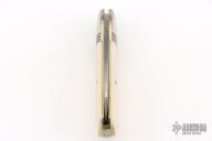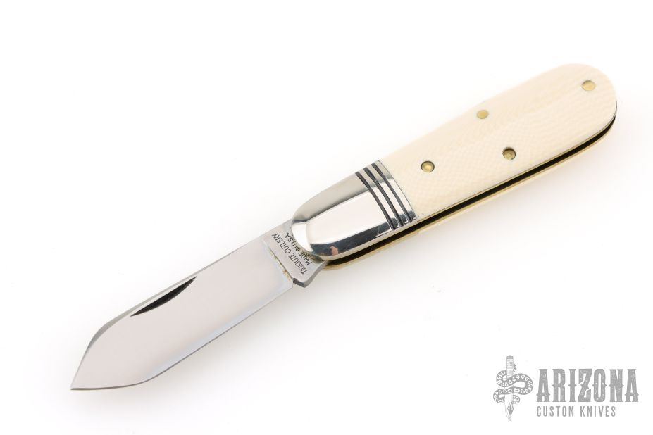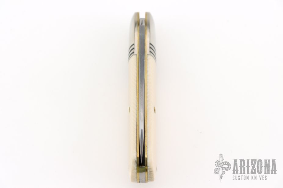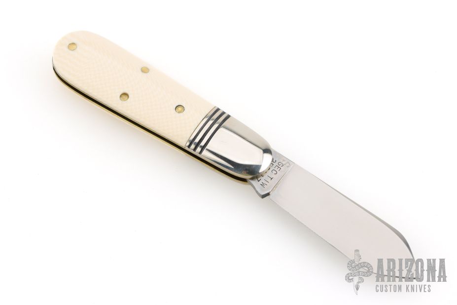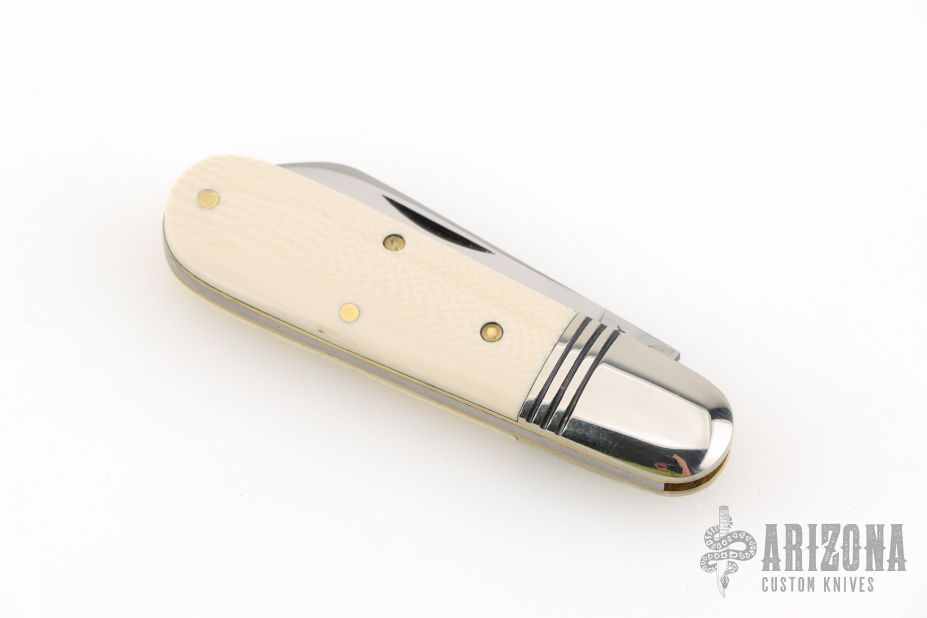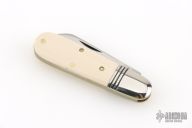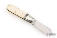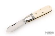This Little Jack slipjoint by Great Eastern Cutlery features a satin finished blade with nail nick. The handle has nickel silver bolsters, unicorn ivory acrylic covers, brass liners and a steel spring. Has half-stop. Includes original tube. Excellent condition. 198 were made. This one is a Factory Second notified by the "S" on the blade and the tube.