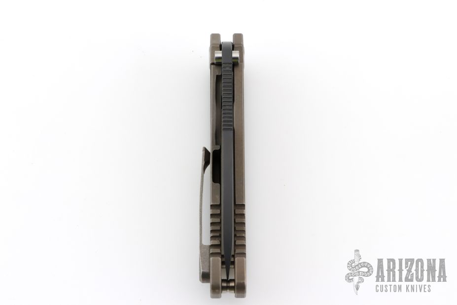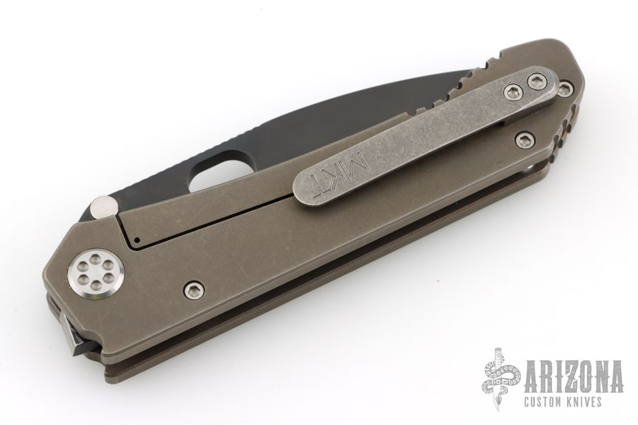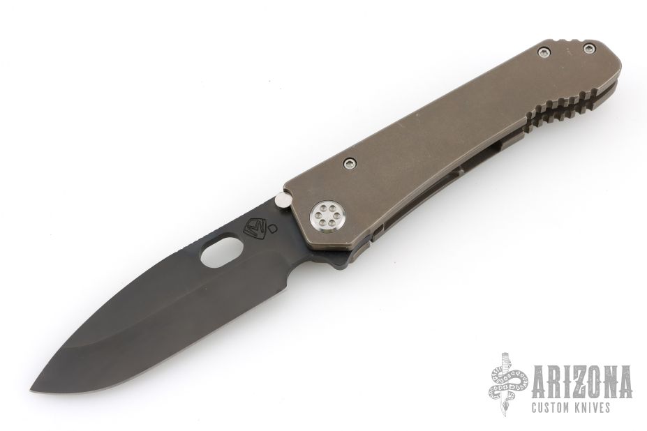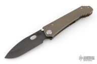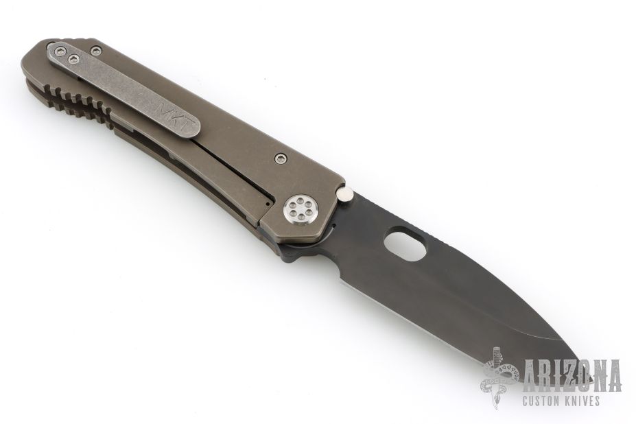 This 187 DP Drop Point by Medford Knife and Tool features a black finished tanto blade with notched thumbrest and thumbhole. The handle has tumble/anodized finished titanium frame and clip. Nice blade seating, detent and lockup. Has some light scuffs and scratches, great overall condition.