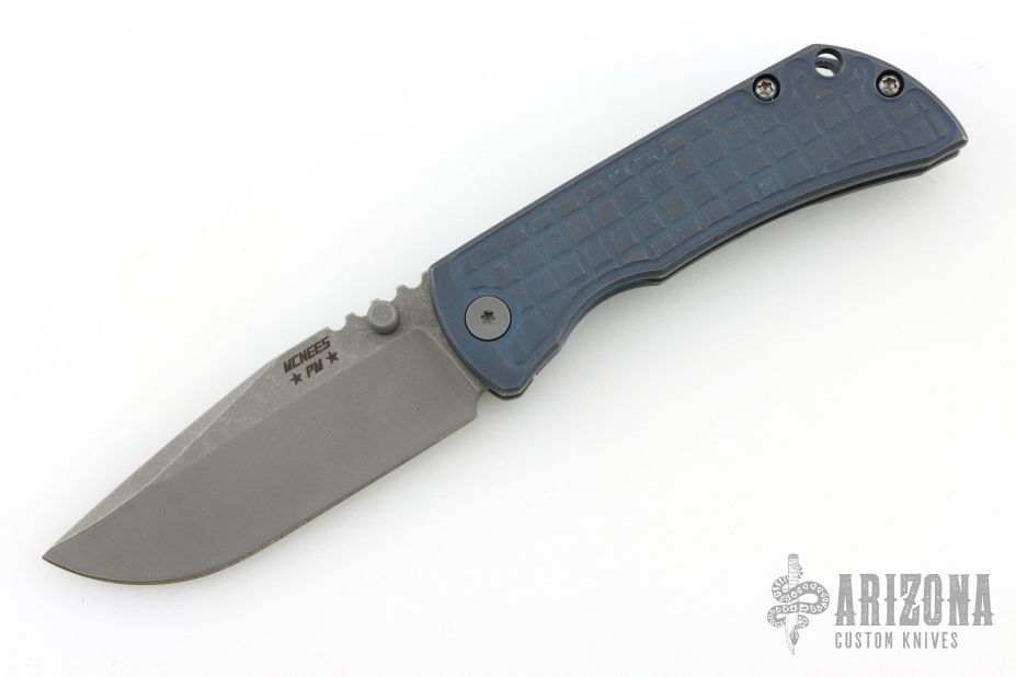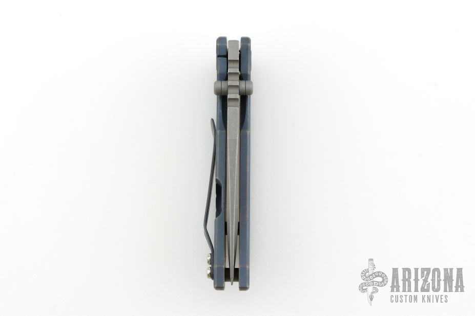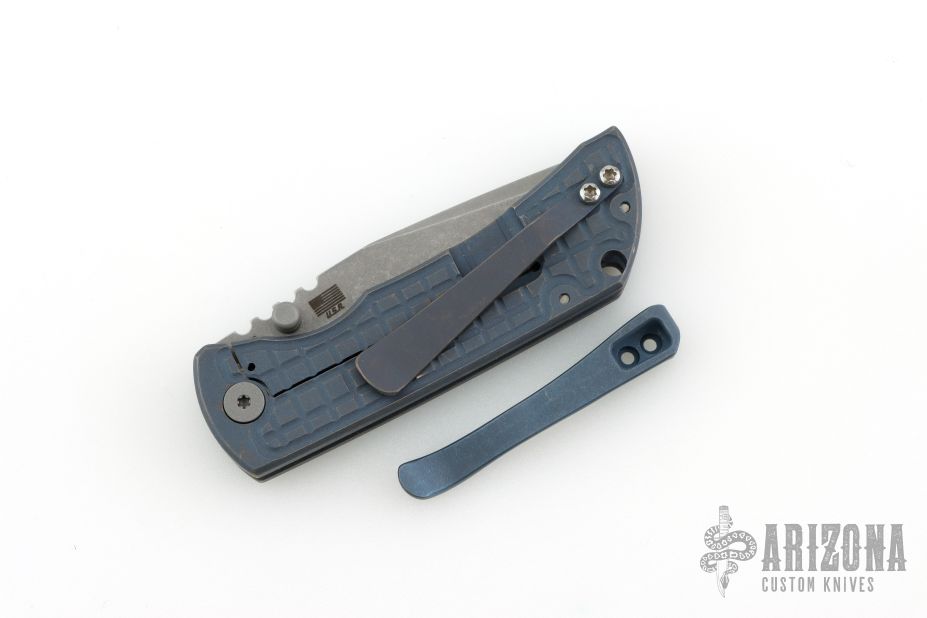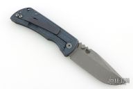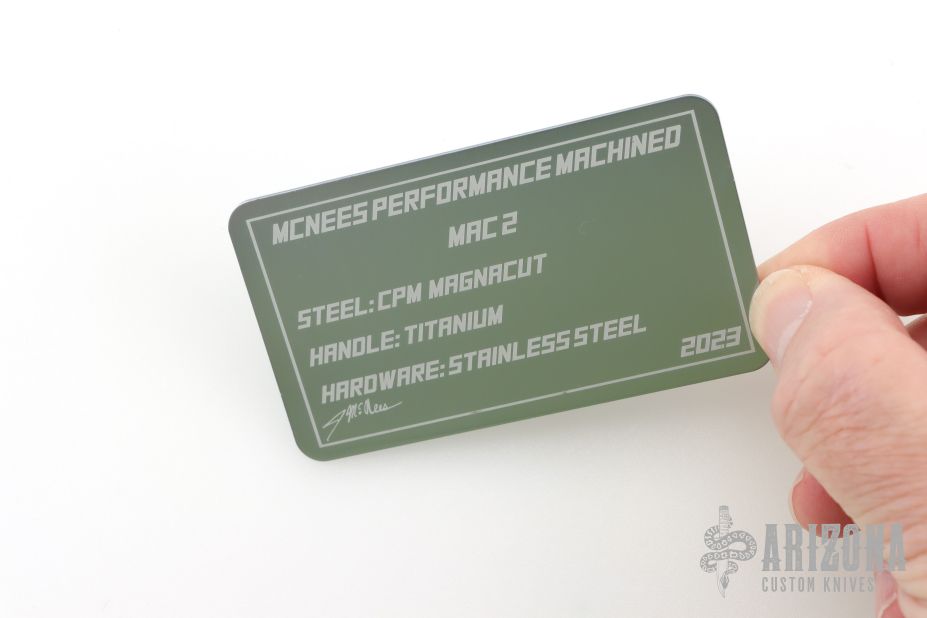 This MAC2 features a stonewashed drop point blade with dual thumbstuds and a notched thumbrest.  The handle features a stonewashed and anodized Frag titanium frame with a matching tip up pocket clip. Comes with original box, card, and deep carry clip. Has a couple light scuffs, otherwise excellent condition.