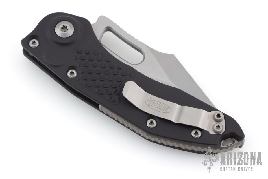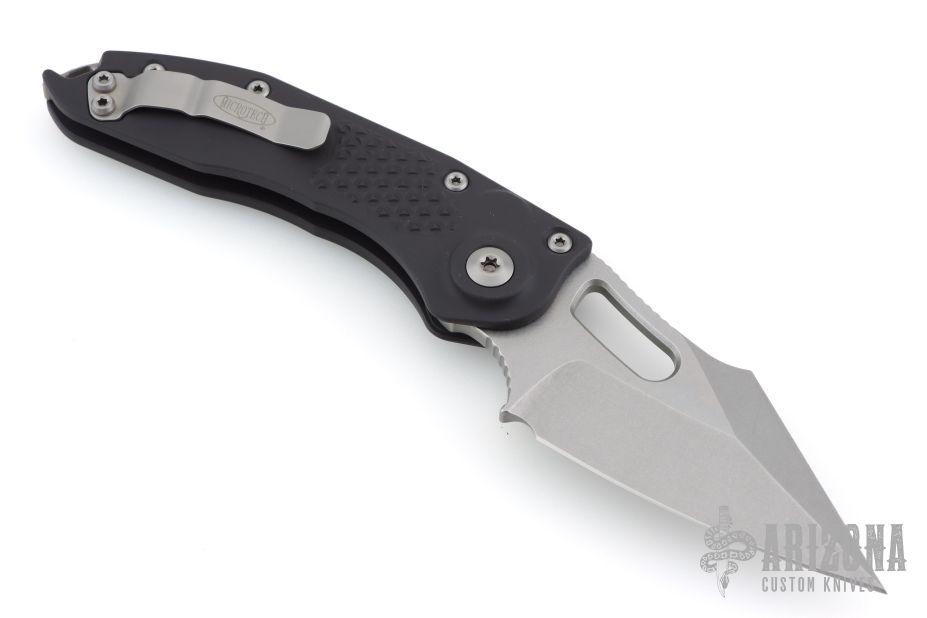 This Stitch Auto by Microtech Knives features a stonewashed blade and false top edge, notched thumb and finger rests. The handle has a black anodized and milled aluminum handle with a bead blasted titanium backspacer and a bead blasted stainless steel clip, tip up carry, lanyard hole at the butt. S/N of 6838 dated 05/2021. Comes with original box and papers. Excellent condition.