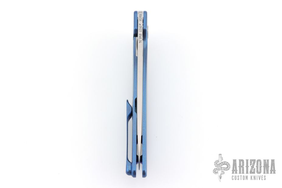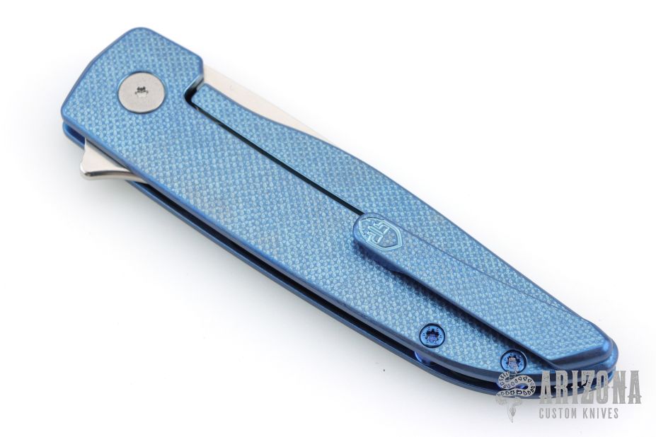 This Rask by John Grimsmo of Grimsmo Knives features a stonewash finished blade with notched flipper. The handle has a "Crosshatch" milled/anodized/tumbled titanium frame with matching tip up clip that has hidden screws, titanium barrel spacers and screws. Numbered #3927 on the spine of the blade. Includes original box and COA dated October 10, 2025. Excellent condition.