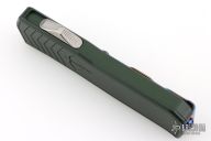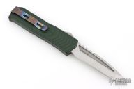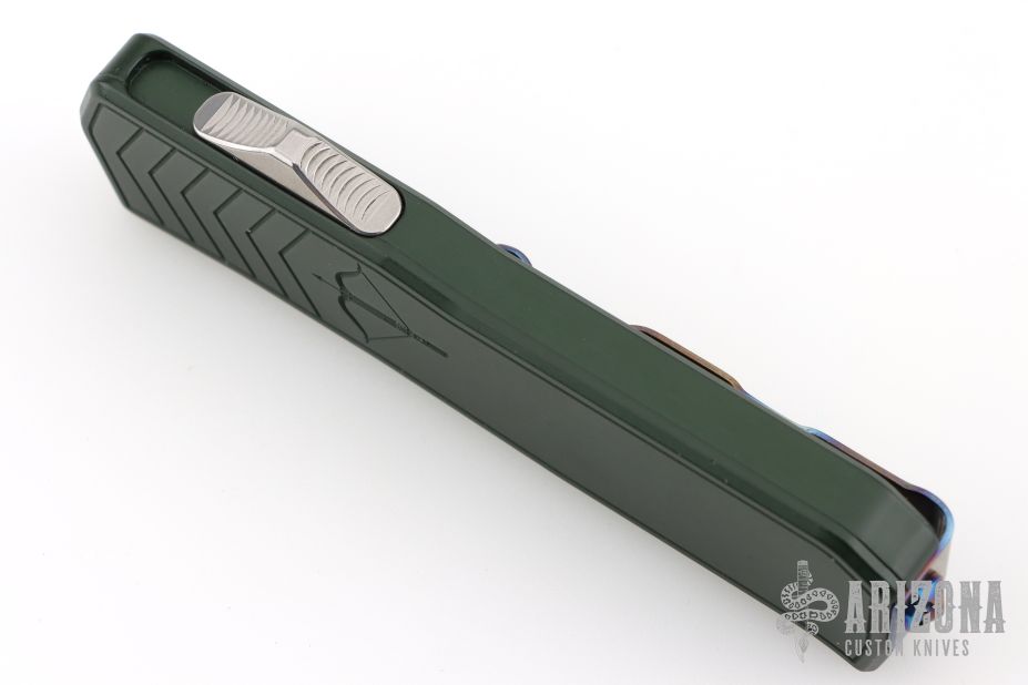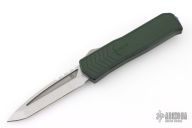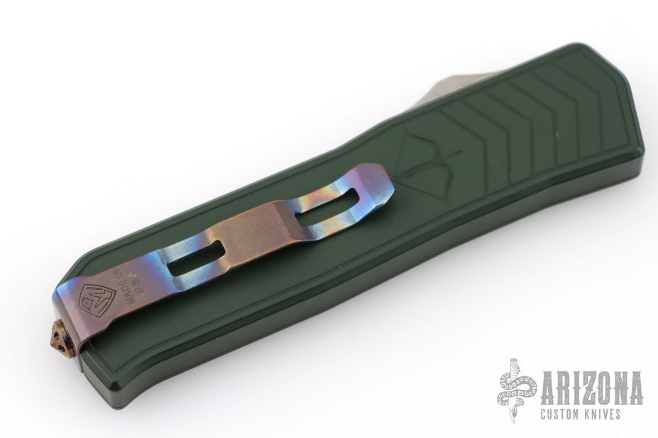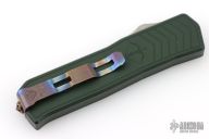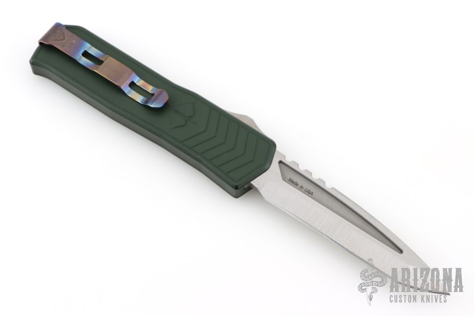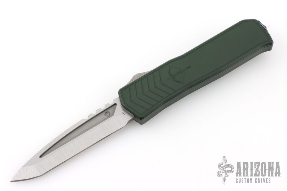 This OTF by Medford Knives features a stonewashed drop point (Tum Tanto) blade with fuller and notched blade spine. The handle features a milled green aluminum body and stonewashed/polished push button with tip down stonewashed/polished titanium clip. Comes with original box, a zippered case, and COA dated March 25, 2025. Box is signed on the interior. Excellent condition.