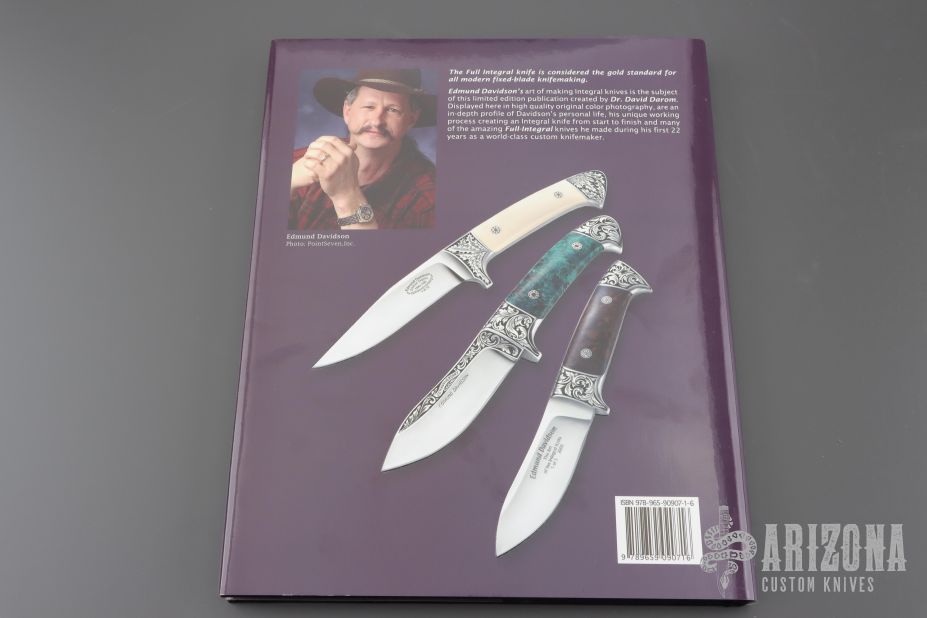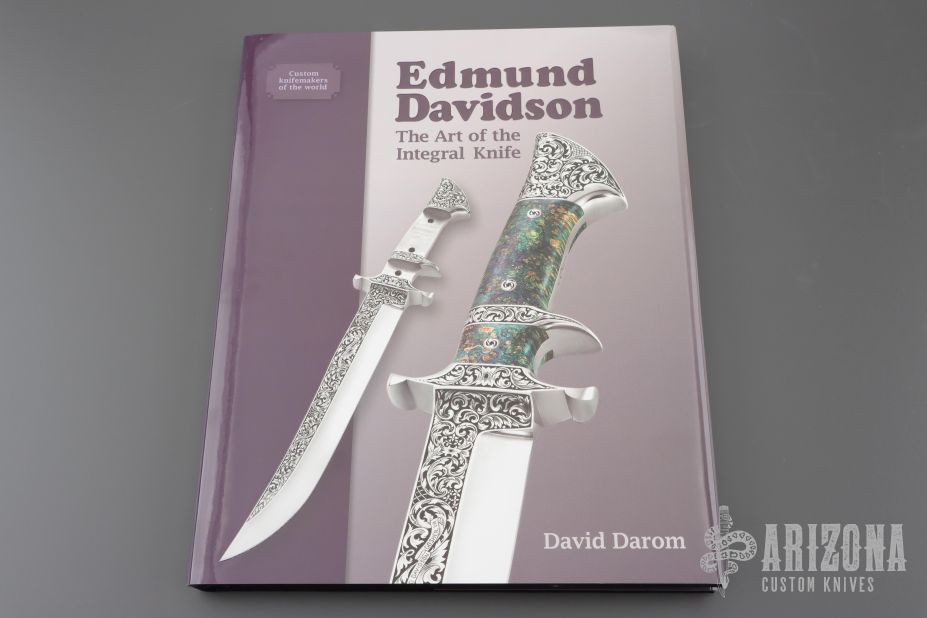"Edmund Davidson—The Art of the Integral Knife is the most recent in a series of coffee table photo essays by David Darom. The book provides a complete history of the maker’s work and includes a full chapter of shop photos detailing how an integral knife is actually crafted. Other sections cover examples of his working knives, art knives, and combat knives from the past. Full-page color photos are used to illustrate a majority of the knives covered. There are also chapters dedicated to Linda Karst Stone, Edmund’s scrimshawer, Jere Davidson, his engraver, and Eric Eggly, his photographer. A final section gives the facts and figures of Davidson’s knifemaking history as well as a full page of blade markings used at one point or another in his career. While this book is obviously a must for anyone specializing in Davidson knives, anyone with a serious interest in custom knives as art work will find it well worth a read."