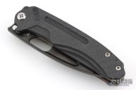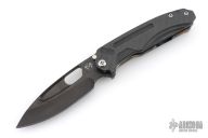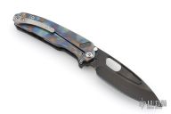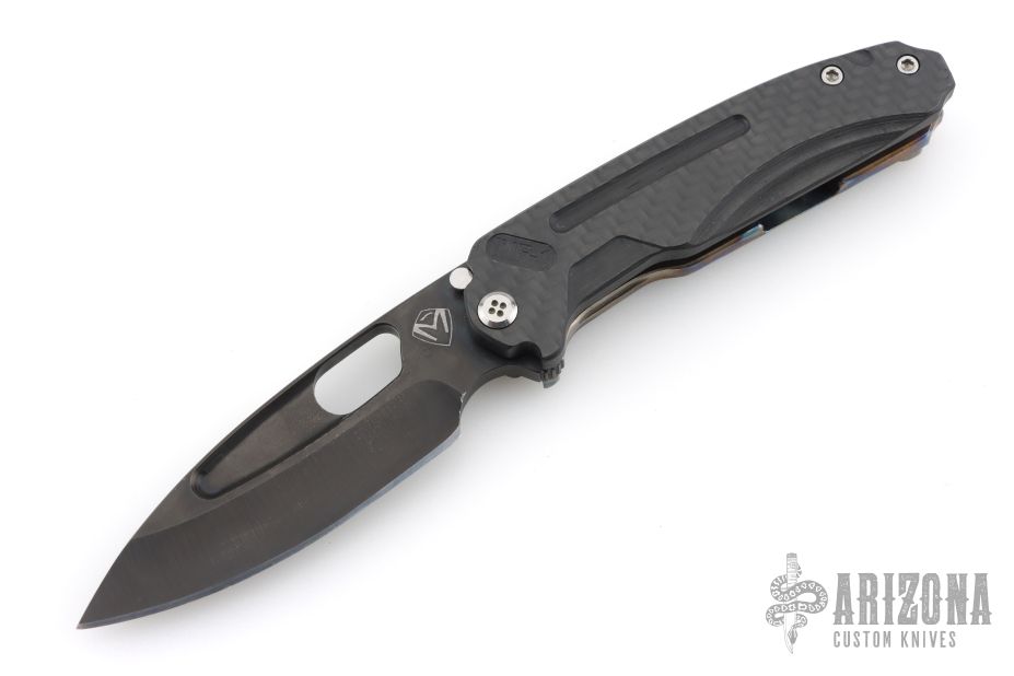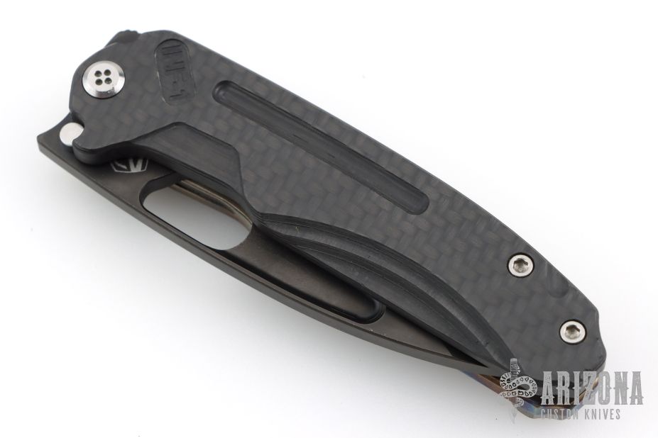 The Infraction by Medford Knife and Tool features a PVD coated drop point blade with a recess and oversized thumb hole. The handle is composed of PVD coated titanium and carbon fiber. The tip up carry pocket clip is composed of titanium. Smooth action and strong detent. Comes with original hard case, and papers. Has some marks on the blade and clip. Great overall condition.