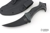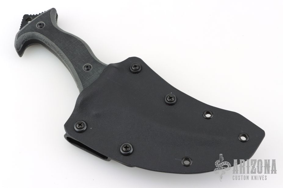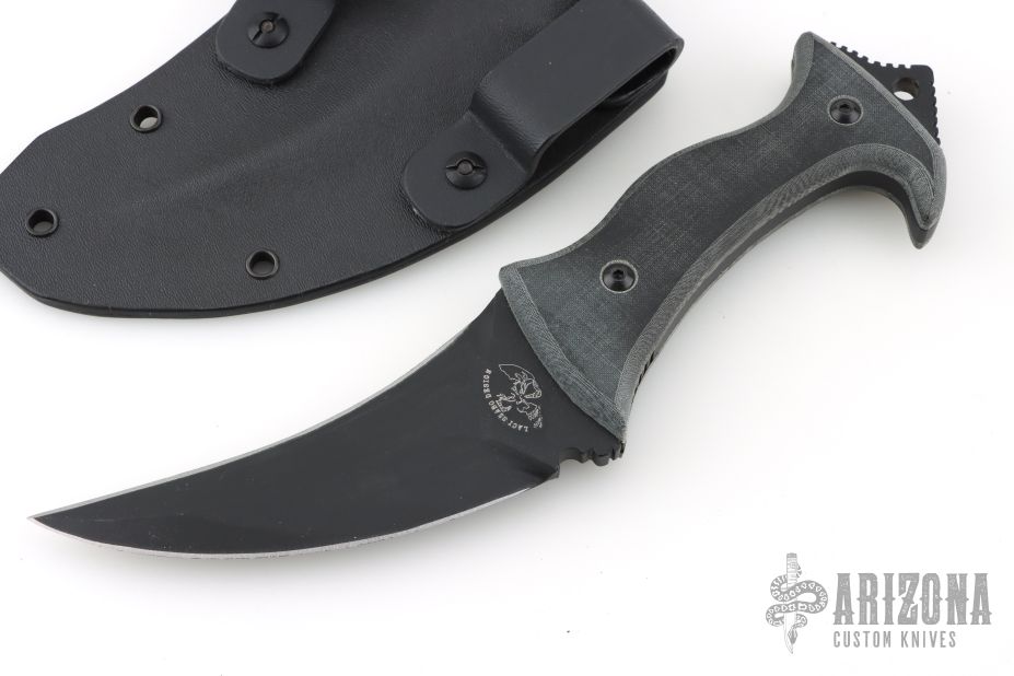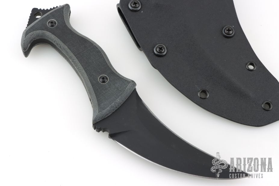 This Omani is a Laci Szabo design executed by Robert Newton, it features a double edged blade, .273" blade stock and 1.755" blade depth, full tang construction with black linen micarta scales and extended tang with lanyard hole. Comes with a kydex sheath with belt loops. New from maker!