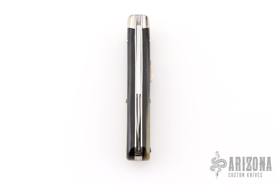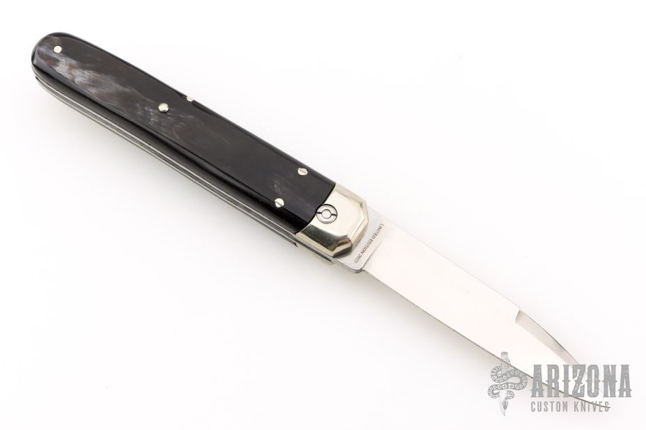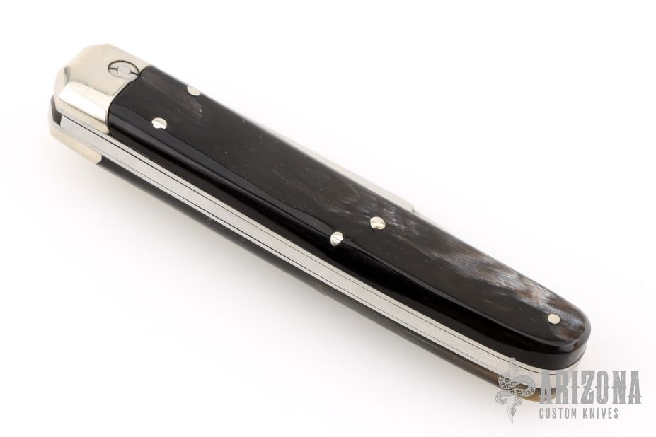 This knife features a high polished tumbled blade drop point blade. The handle has nickel silver bolsters and push button with buffalo horn scales. Steel liners Includes the original box and leather slip sheath. Excellent Condition.