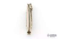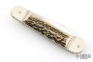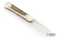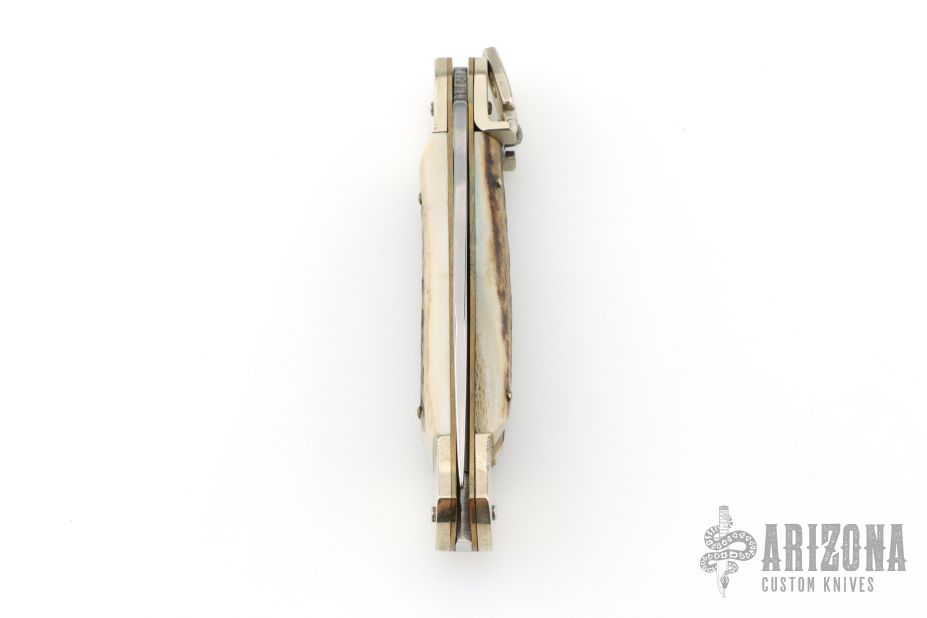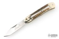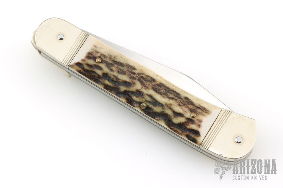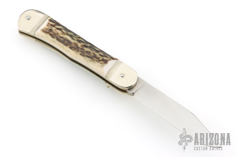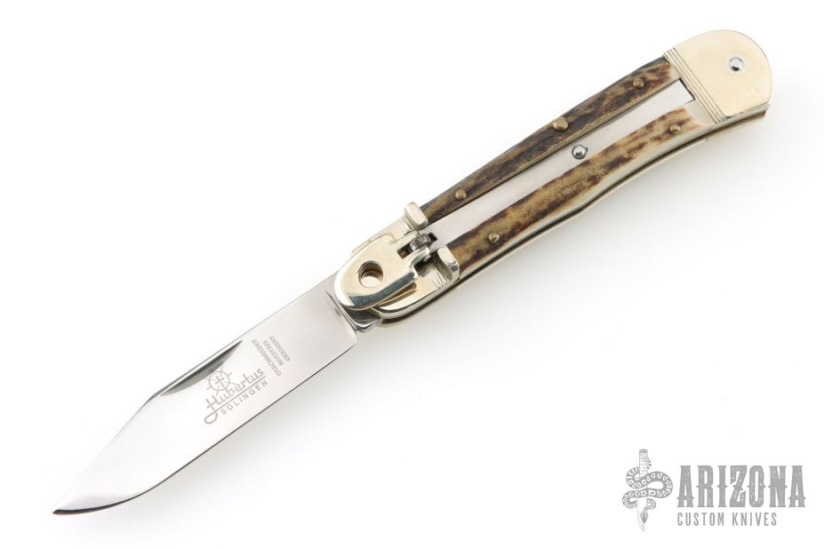 This leverlock auto by Hubertus features a mirror polished blade with nail nick. The handle has, fluted nickel silver double bolsters, stag scales, brass liners and brass pins. Opens with a nice snap. Very fast opening. Excellent condition.