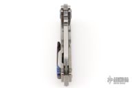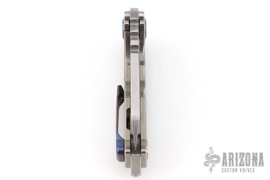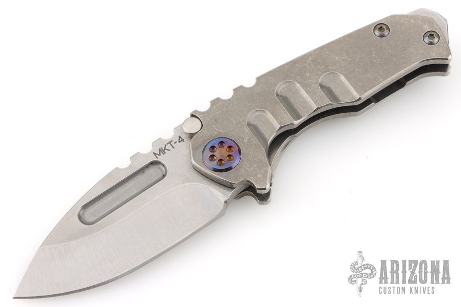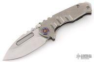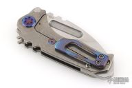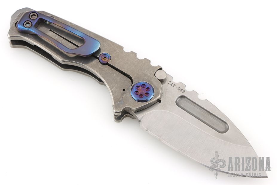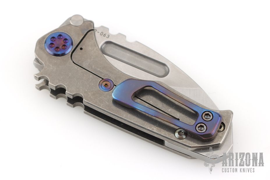This Micro Praetorian from Medford Knife and Tool features a satin finished drop point blade with notched thumbrest and fullers. The handle has a stonewashed titanium frame with an anodized titanium tip up pocket clip. Stainless steel backspacer doubles as a glass breaker. Excellent condition.