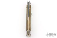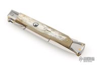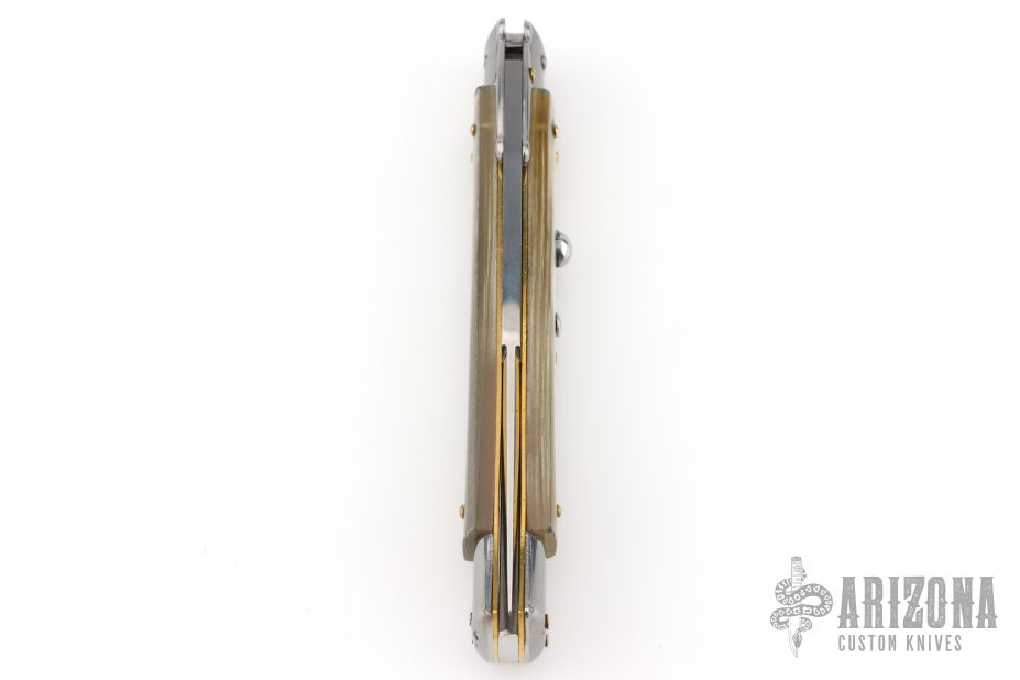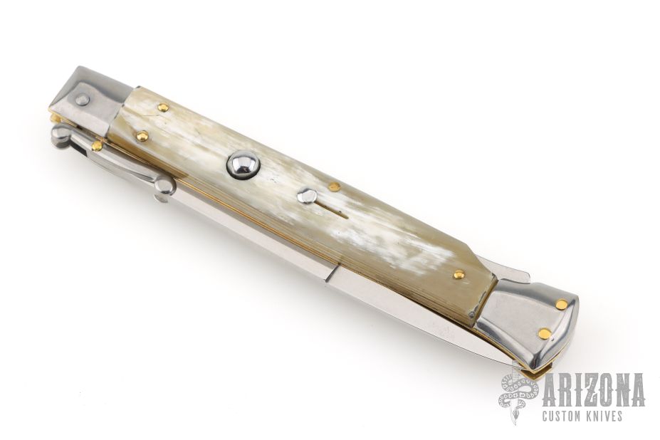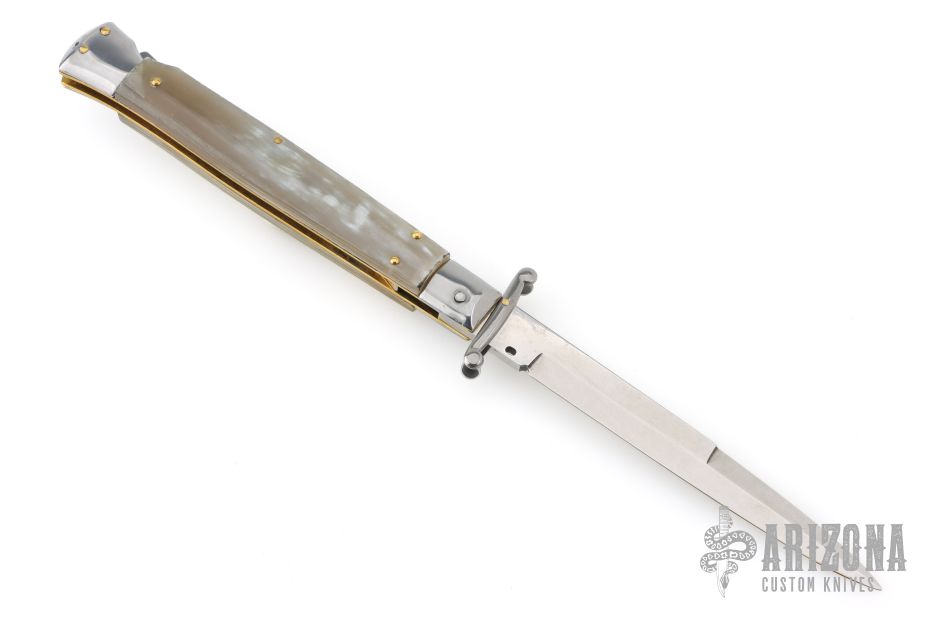 This 11" Swing Guard Auto by Frank Beltrame features a 4mm bayonet ground blade with false top edge. The handle has stainless steel bolsters, front and rear, honey horn scales, brass liners, stainless spring. Excellent condition.