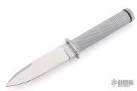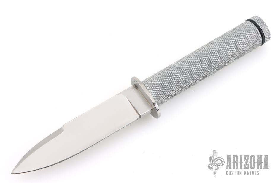 This Survival Knife by Dan Thornton features a satin finished spear point blade with false top edge, hollow handle construction, .189" blade stock and 1" blade depth. The handle has a stainless steel guard, hollow knurled aluminum handle and a removeable aluminum butt cap. Comes with a zippered case. Excellent condition. Has matches in the handle.