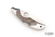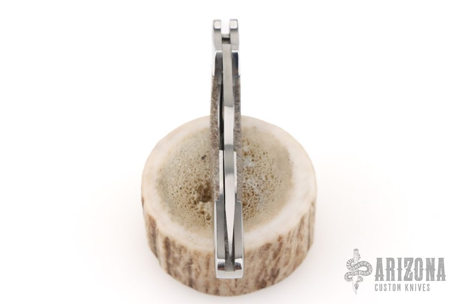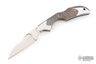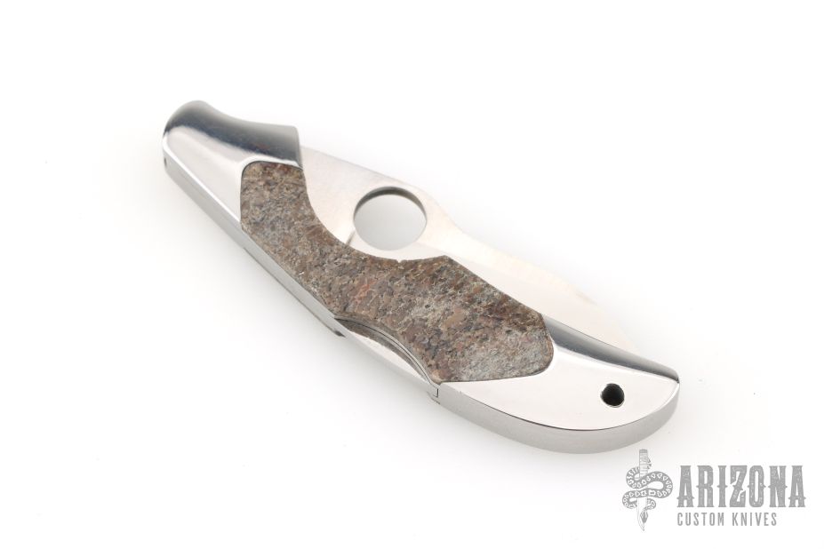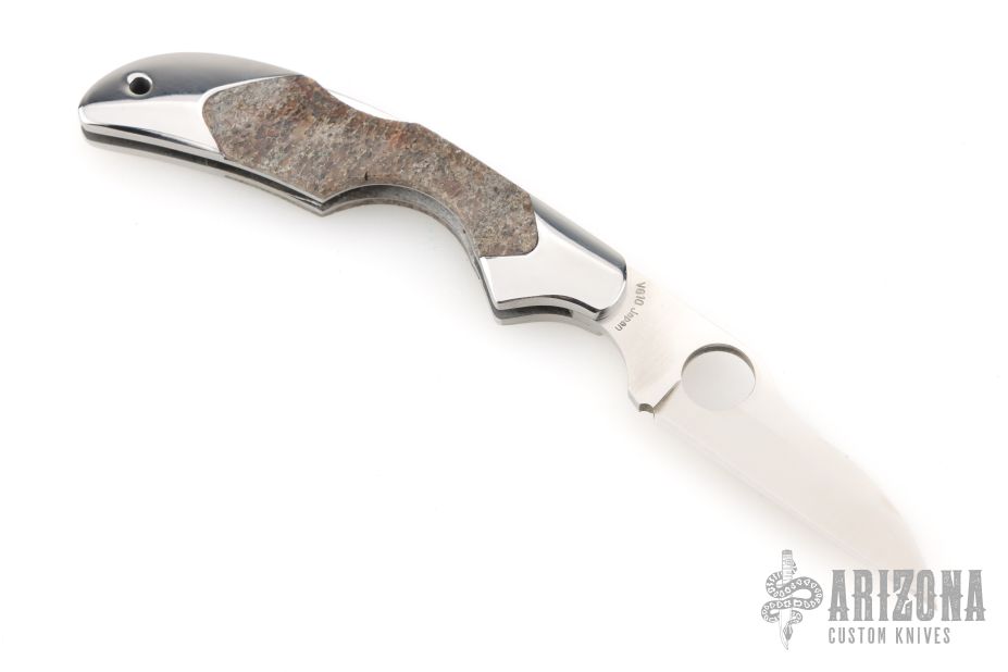 This Kiwi lockback by Spyderco has a customized dinosaur bone handle by Santa Fe Stoneworks. Has a satin finished blade with thumbhole. Stainles steel frame. Excellent condition.