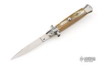 This Swivel Bolster by Frank Beltrame features a tumble polished spear point blade with false top edge. The handle is comprised of stainless steel bolsters and pommel with honey horn scales over brass liners and stainless steel backspacer. Excellent Condition.