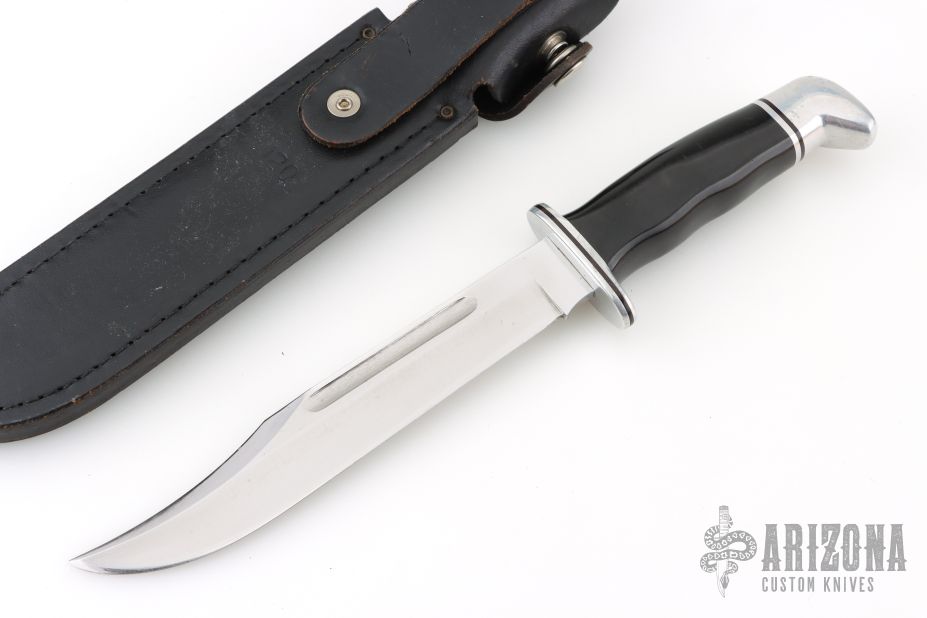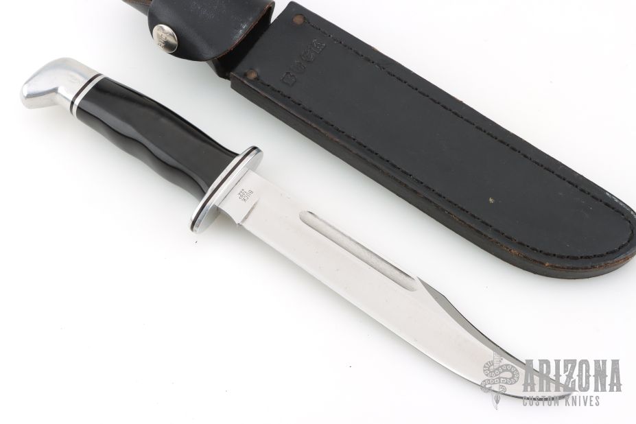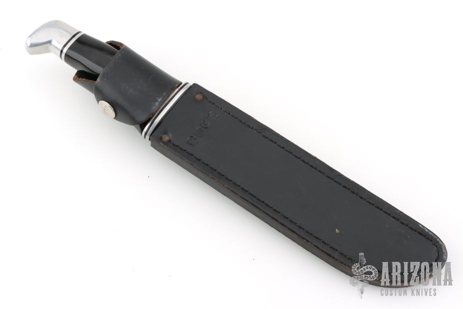 This Model 120 by Buck Knives features a satin finished clip point blade with false top edge and fullers, .178" blade stock and 1.035" blade depth, hidden tang construction. The handle has an aluminum guard and butt, and a black grip. Comes with black leather sheath. Has some scratches, and has been resharpened. Great overall condition.