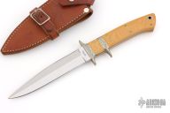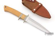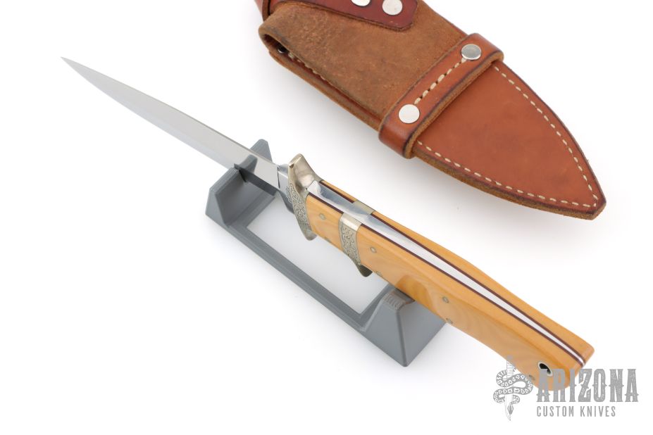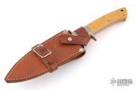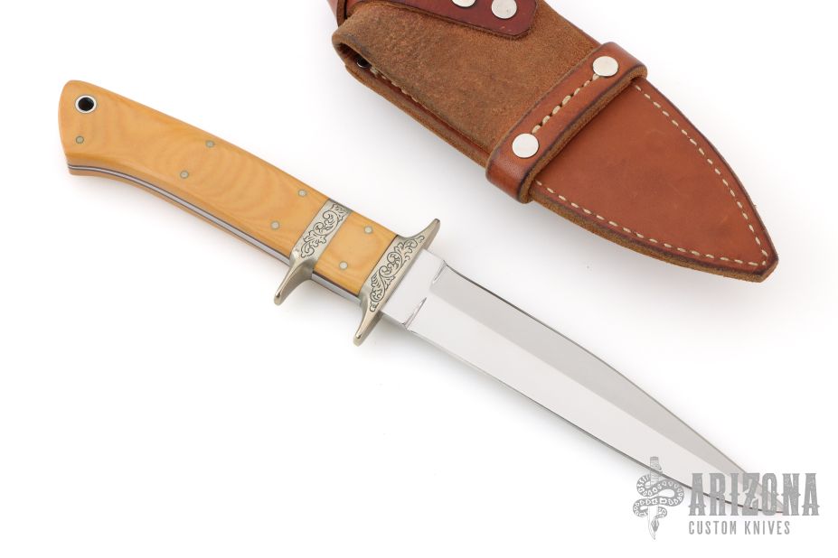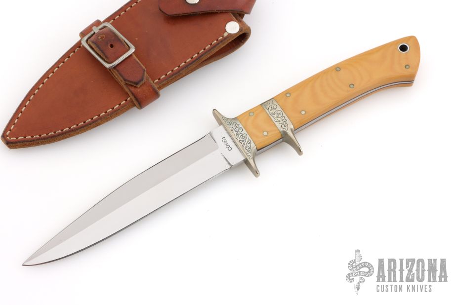 This sub-hilt fighter by Harold Corby features a satin-polished blade with sharpened top edge, .195" blade stock and .964" depth, full tapered tang construction. The handle has an engraved nickel silver guard and sub-hilt, vintage paper micarta scales and nickel silver pins. Comes with a brown leather sheath. Has a light patina, excellent condition.