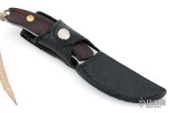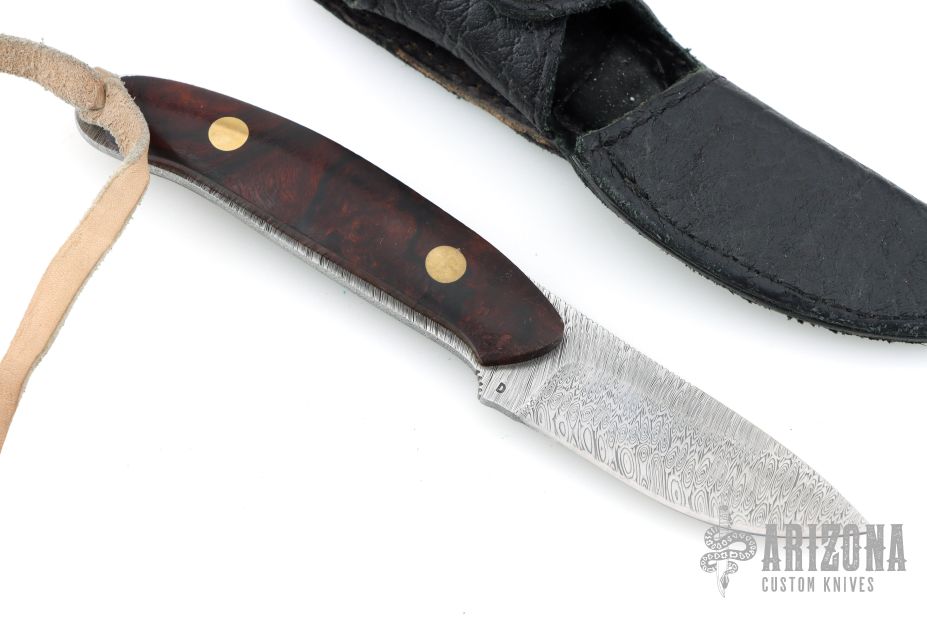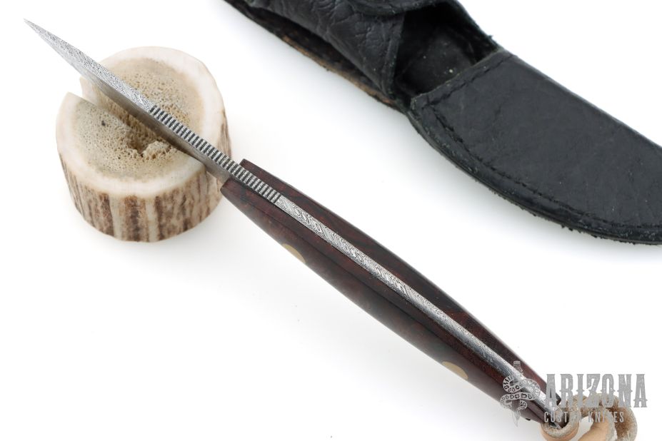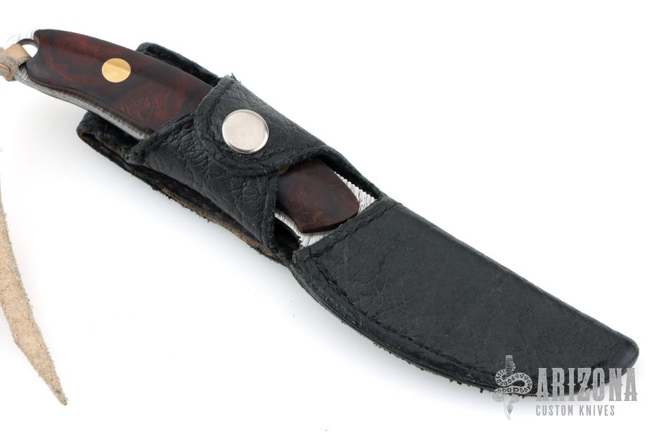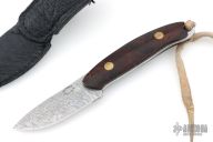 This Semi-Skinner by Jerry Halfrich features a Damasteel blade with notched thumbrest, .123" blade stock and 1.022" blade depth, full tang construction with desert ironwood burl scales with brass pins. Comes with a black leather sheath. Has been sharpened, otherwise excellent condition.