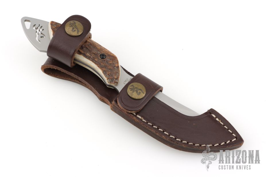 This is a model 257 by Browning has a bead blasted blade with notched thumbrest, .146" blade stock and 1.160" blade depth, full tang construction. The handle has stag scales. Comes with original box and brown leather sheath. Excellent condition.