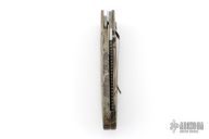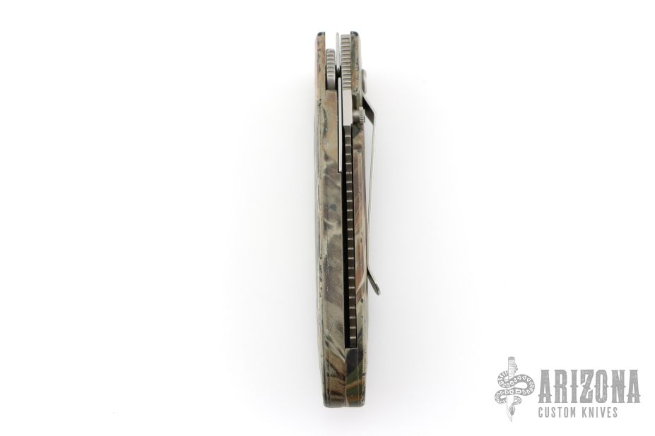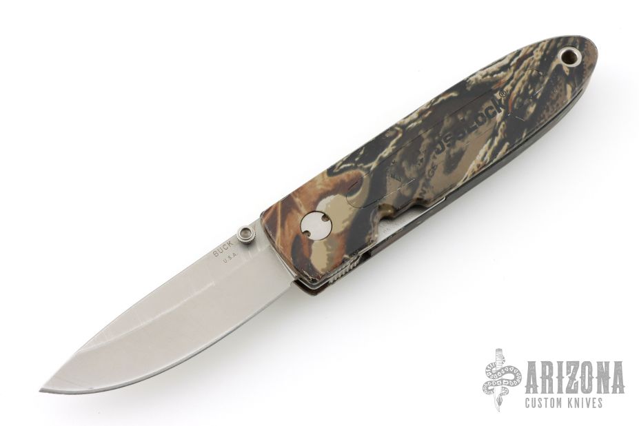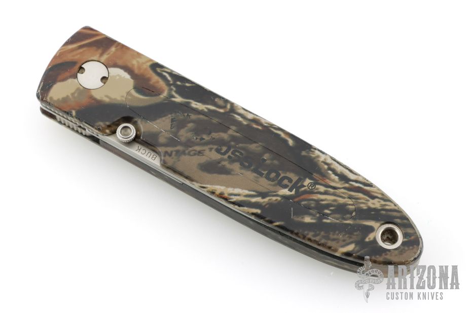 This CrossLock by Buck Knives features bead blasted blades with thumbstuds, one is a drop point and the other is a guthook with a bone saw. The handle has a camo composite frame with stainless steel liners and tip down clip. Has some scratches and scuffs, otherwise good user condition.