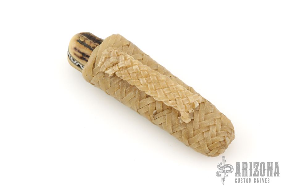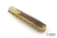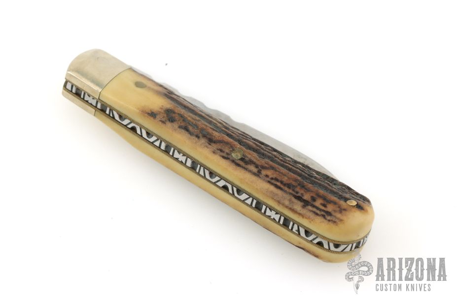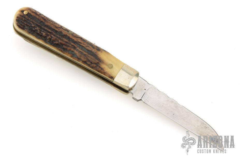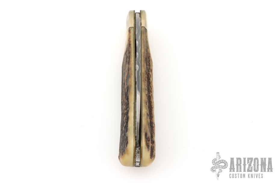 This slipjoint by A. Wright & Sons Sheffield England features a mirror finished sheepsfoot blade with nail nick and fileworked spine. The handle features nickel silver bolsters, stag covers, coin edged brass liners, fileworked steel spring. Comes with a rawhide sheath. Has scratches and patina, has been sharpened, otherwise good condition.