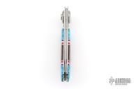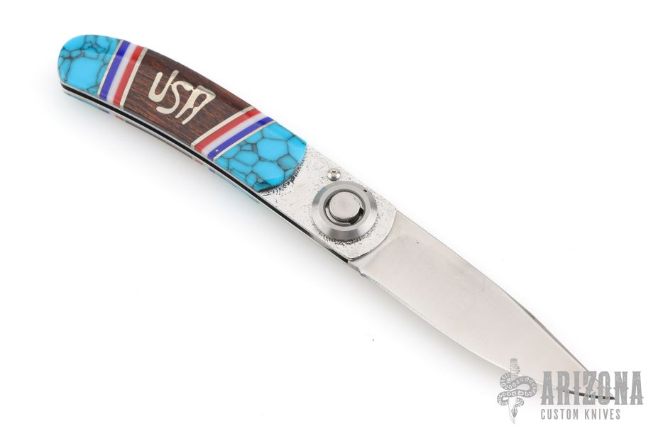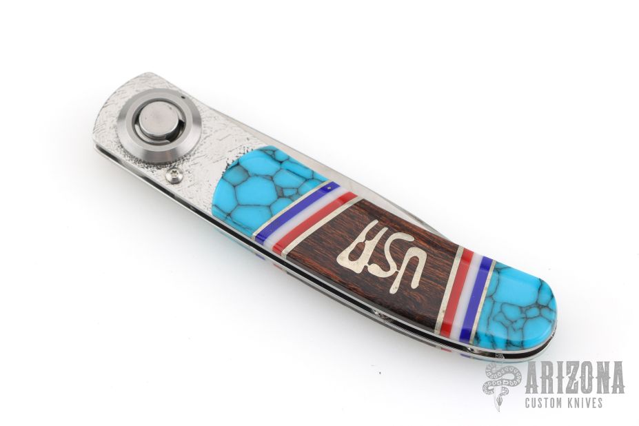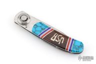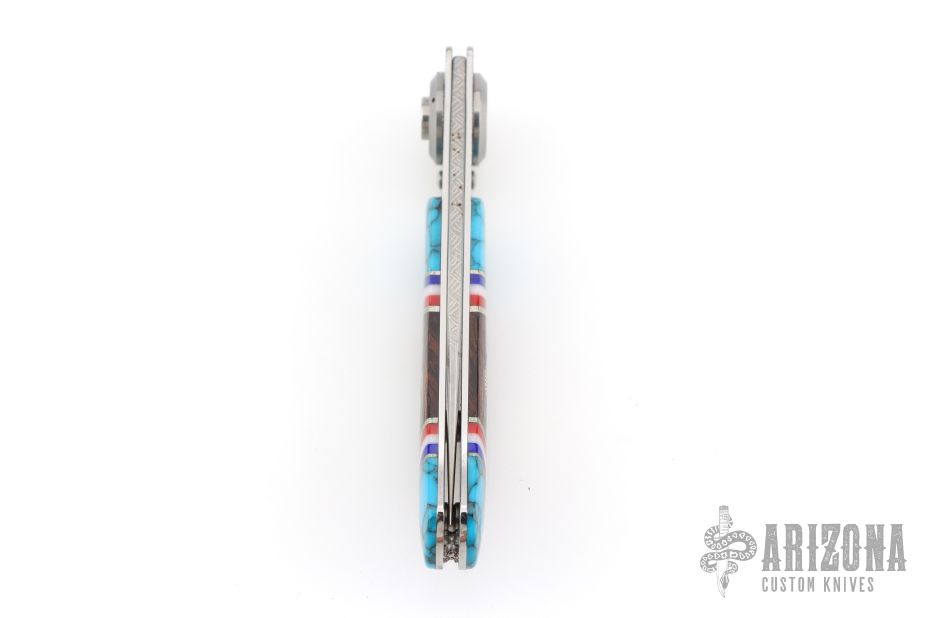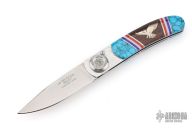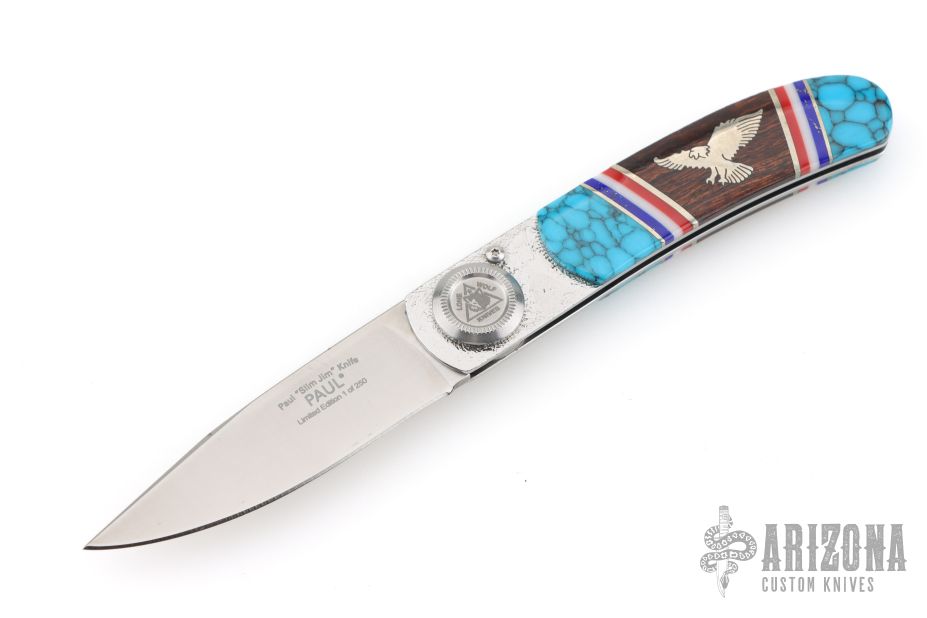 This Paul Slim Jim from Lone Wolf Knives features a polish satin finished clip point style blade. The handle is comprised of ironwood/turquoise/sterling silver overlays over a stainless steel frame and barrel spacers. Pivot features the Paul Axial Locking Mechanism. Excellent condition. Comes with original box, tin, and papers.