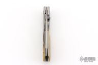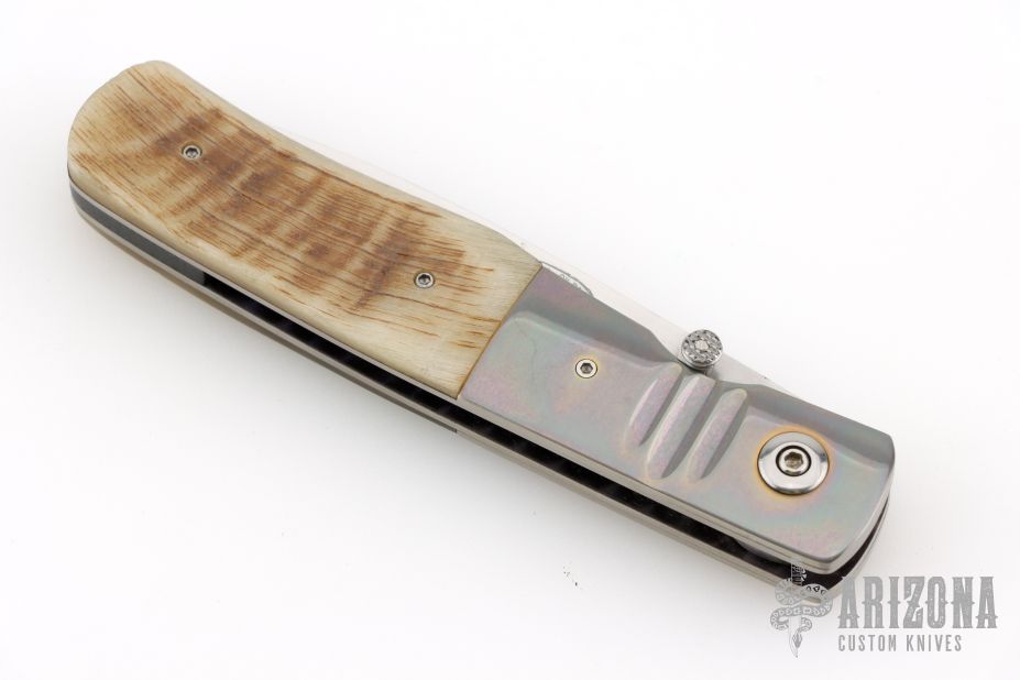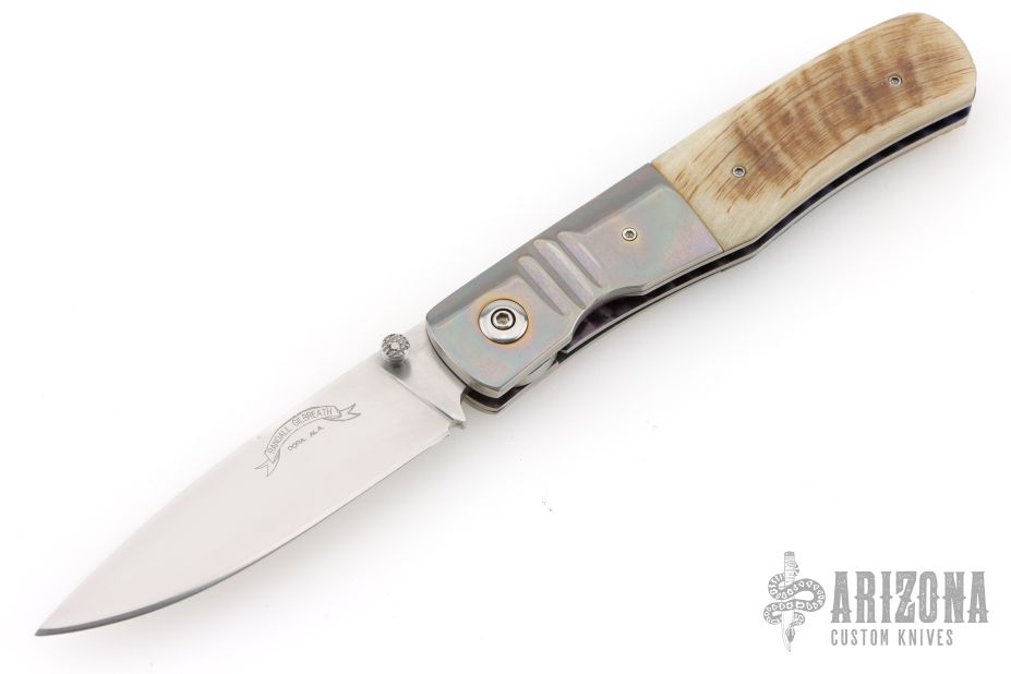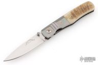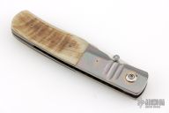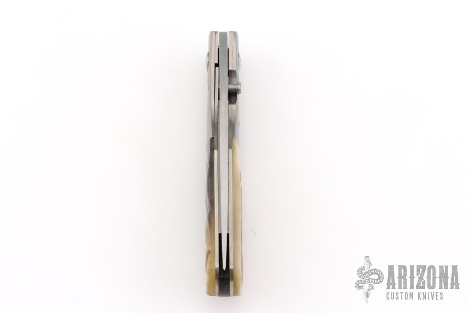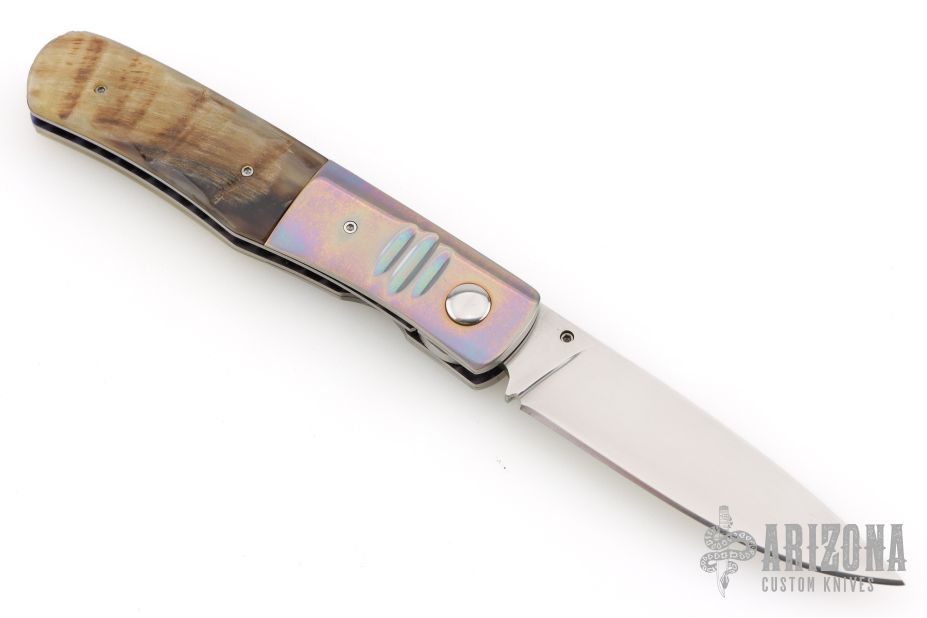 This knife by Randall Gilbreath features a hand rub satin finished clip point blade with a single thumb stud. The handle has fluted and anodized titanium bolsters, ram horn scales and G10 backspacer, polished finished titanium liners. Nice detent, lockup and blade seating. Excellent condition.